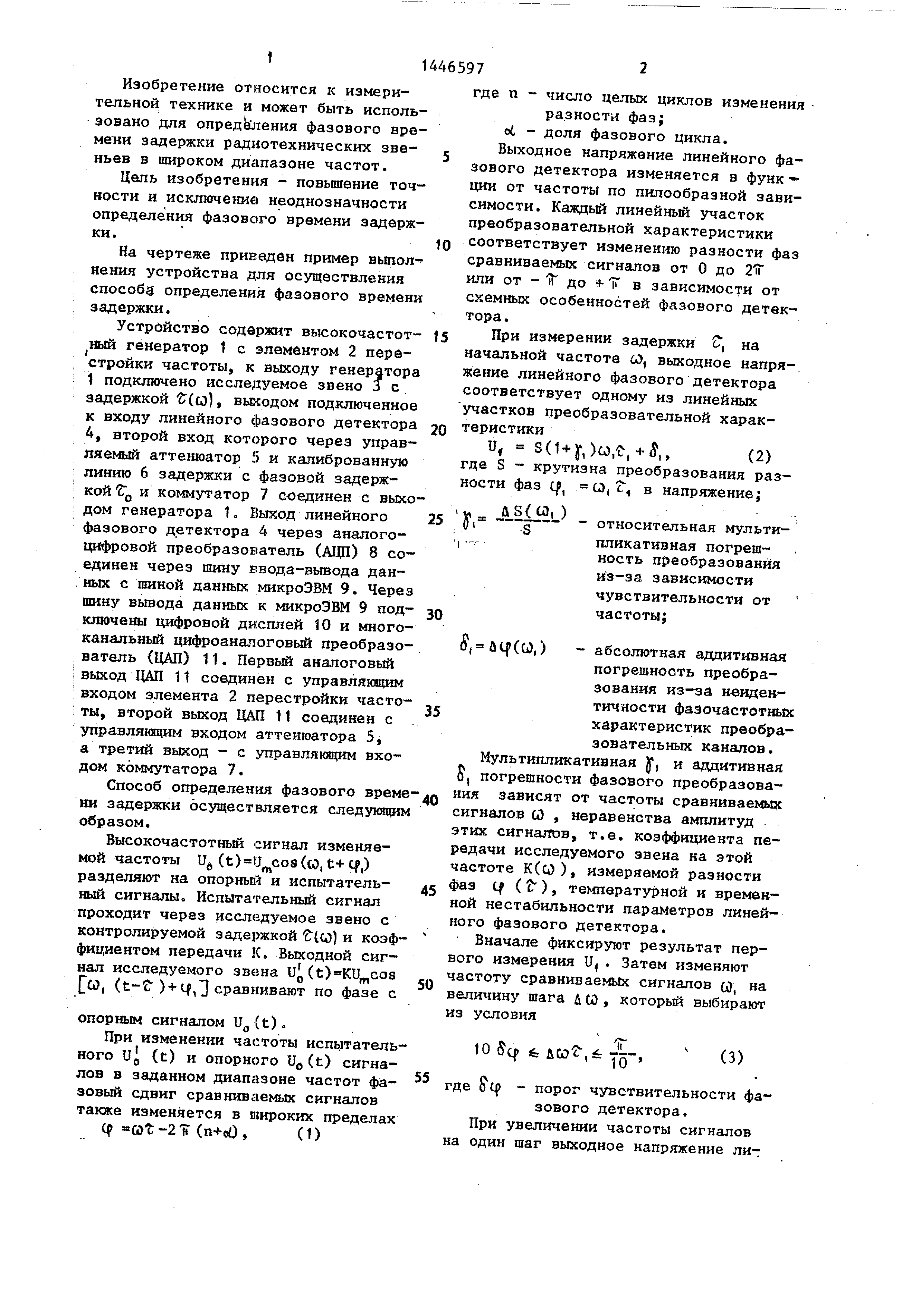 нения устройства для осзпдествления способу определения фазового времени задержки. Устрййство содержит высокочастотный генератор 1 с элементом 2 перестройки частоты, к выходу генер§тора