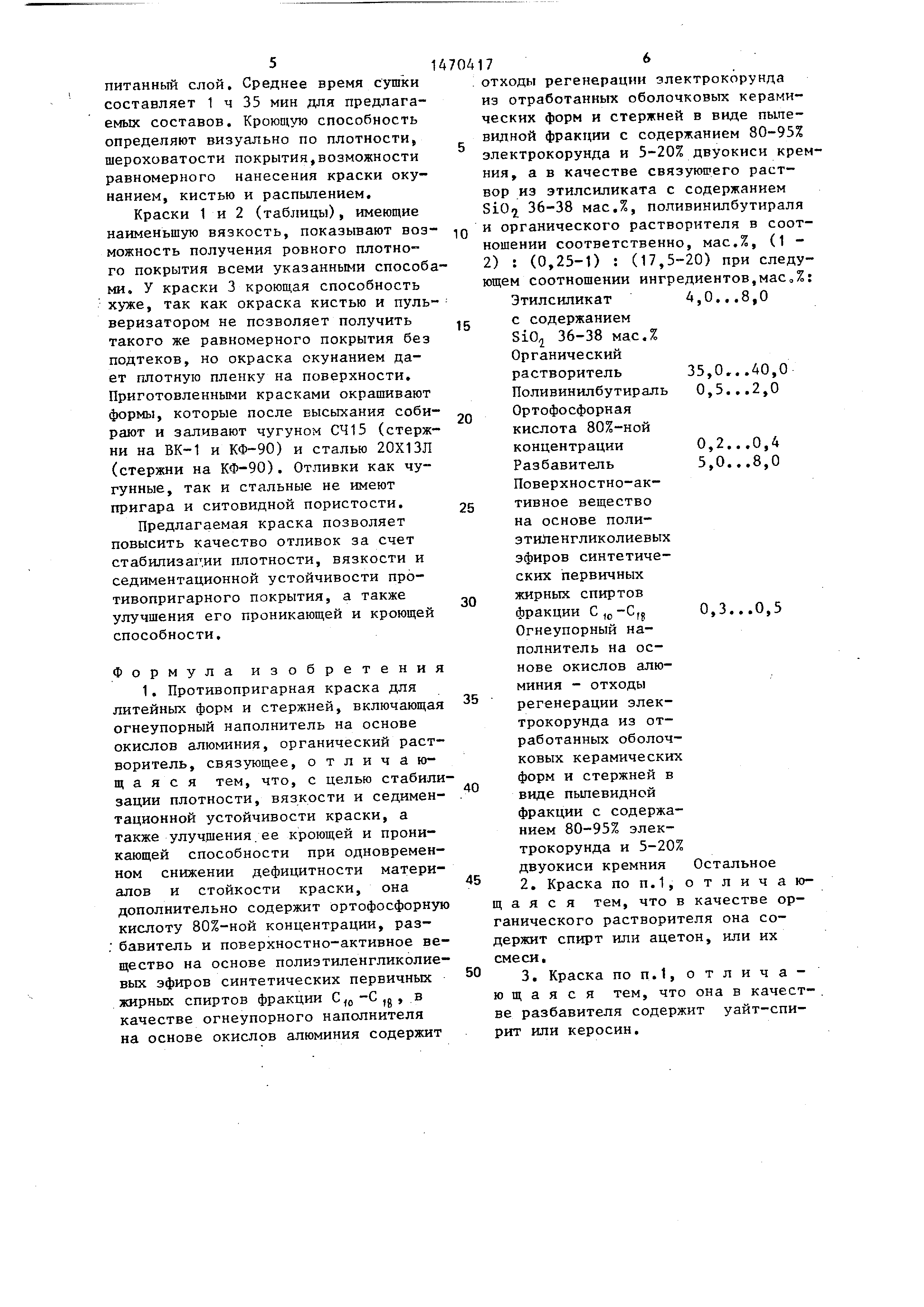 поливинилбутираля и этилсиликата -40 в органическом растворителе. Противопригарная краска содержит, мас.%: этилсиликат (с содержанием SIO236,0 ... 38,0 мас.%) 4,0 ... 8,0 органический растворитель 35,0 ... 40,0 поливинилбутираль 0,5...2,0 ортофосфорную кислоту 80%-ной концентрации 0,2...0,4 разбавитель 5,0...8,0 поверхностно-активное вещество на основе полиэтиленгликолевых эфиров синтетических первичных жирных спиртов фракции С10-С180,3...0,5 огнеупорный наполнитель на основе окислов алюминия - отход регенерации электрокорунда из отработанных оболочковых керамических форм и стержней в виде пылевидной фракции с содержанием 80-95% электрокорунда и 5-20% двуокиси кремния
