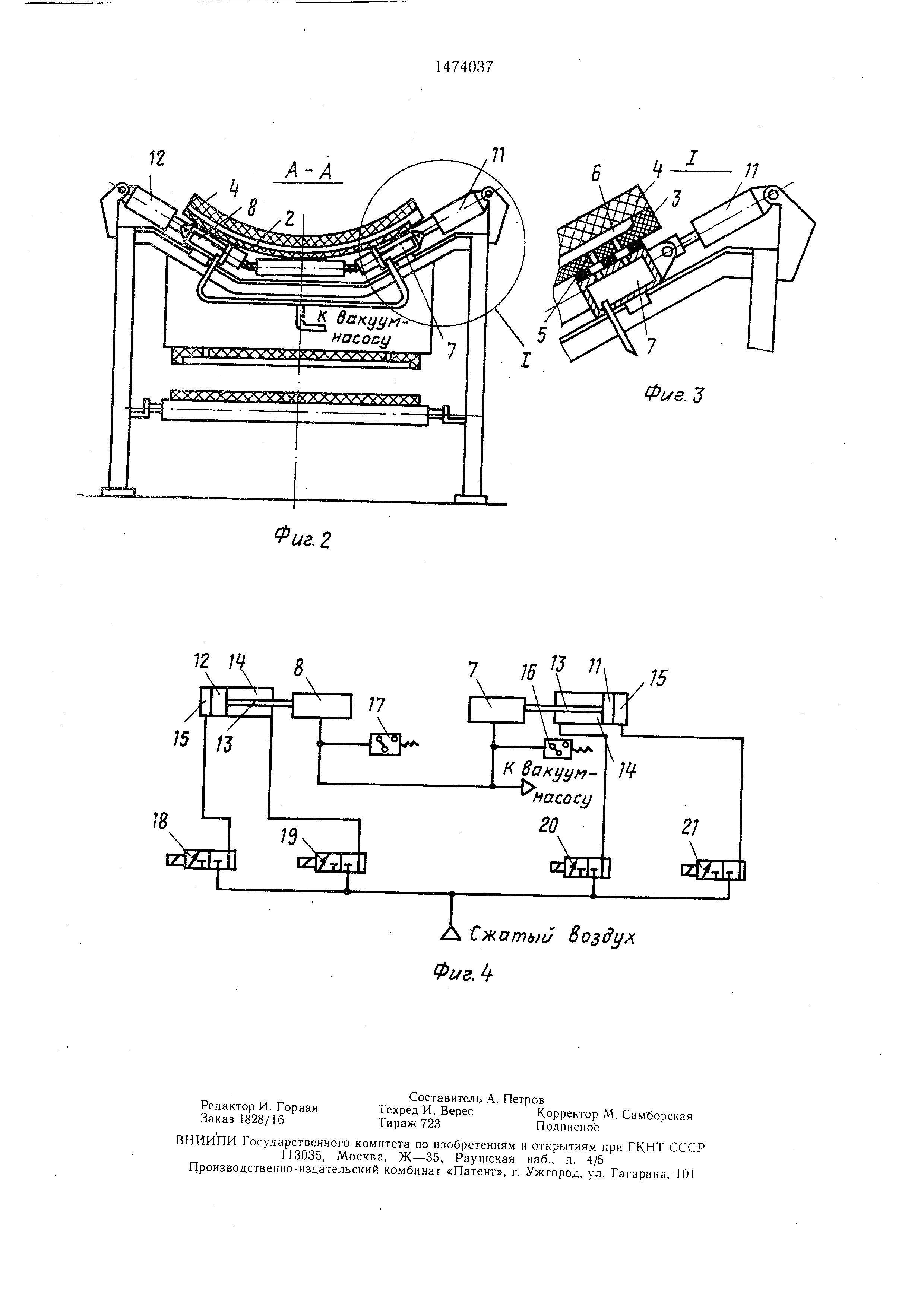 лентой 3 и грузонесущей лентой 4. Лента 3 выполнена со сквозными отверстиями и пазами и расположена на правой и левой частях коллектора. Коллектор связан с вакуумным насосом. Обе части коллектора снабжены реле давления (РД) и установлены с