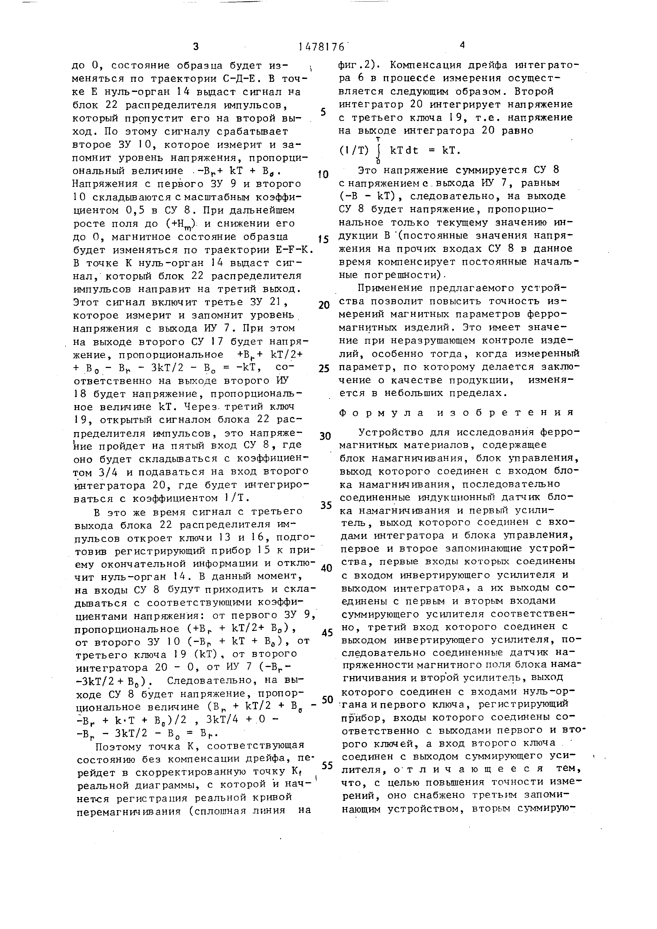 Устройство для исследования ферромагнитных материалов, содержащее блок намагничивания, блок управления, выход которого соединен с входом блока намагничивания, последовательно соединенные индукционный датчик блока намагничивания и первый усилитель , выход которого соединен с входами интегратора и блока управления, первое и второе запоминающие устройства , первые входы которых соединены с входом инвертирующего усилителя и выходом интегратора, а их выходы соединены с первым и вторым входами суммирующего усилителя соответственно , третий вход которого соединен с выходом инвертирующего усилителя, последовательно соединенные датчик напряженности магнитного поля блока намагничивания и второй усилитель, выход которого соединен с входами нуль-ор- танаи первого ключа, регистрирующий прибор, входы которого соединены соответственно с выходами первого и второго ключей, а вход второго ключа соединен с выходом суммирующего усилителя , отличающееся тем, что, с целью повышения точности измерений , оно снабжено третьим запоминающим устройством, вторым суммирую514