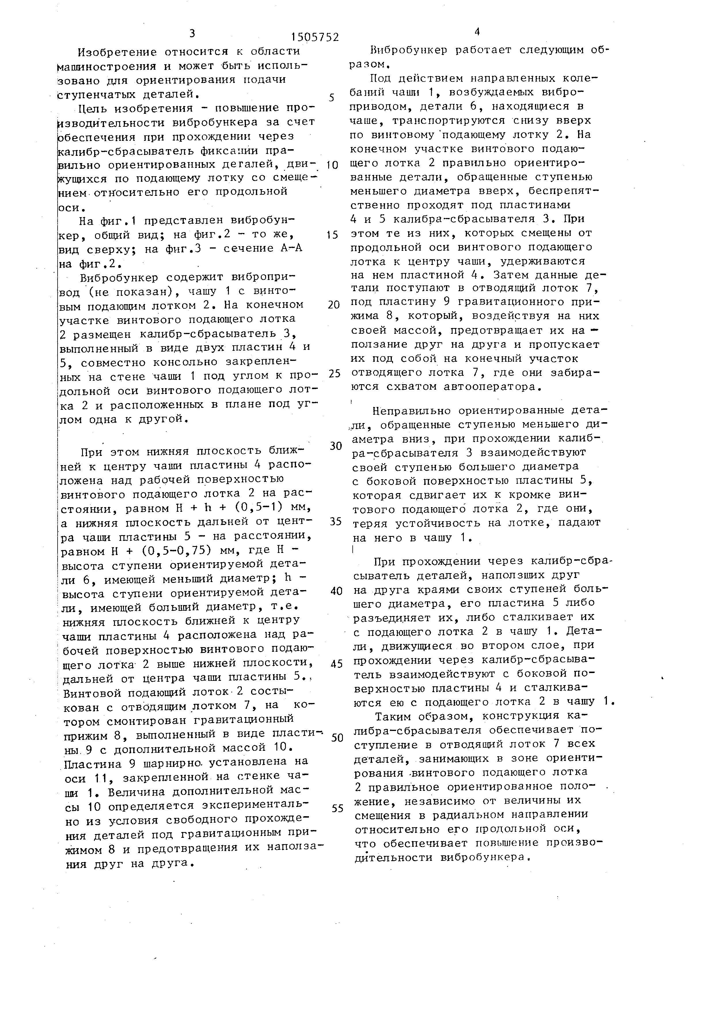которого смонтирован калибр-сбрасыватель 3, выполненный в виде двух пластин 4 и 5, совместно консольно закрепленных на стенке чаши и расположенных в плане под углом одна к другой. Детали, обращенные ступенью меньшего диаметра вверх, беспрепятственно