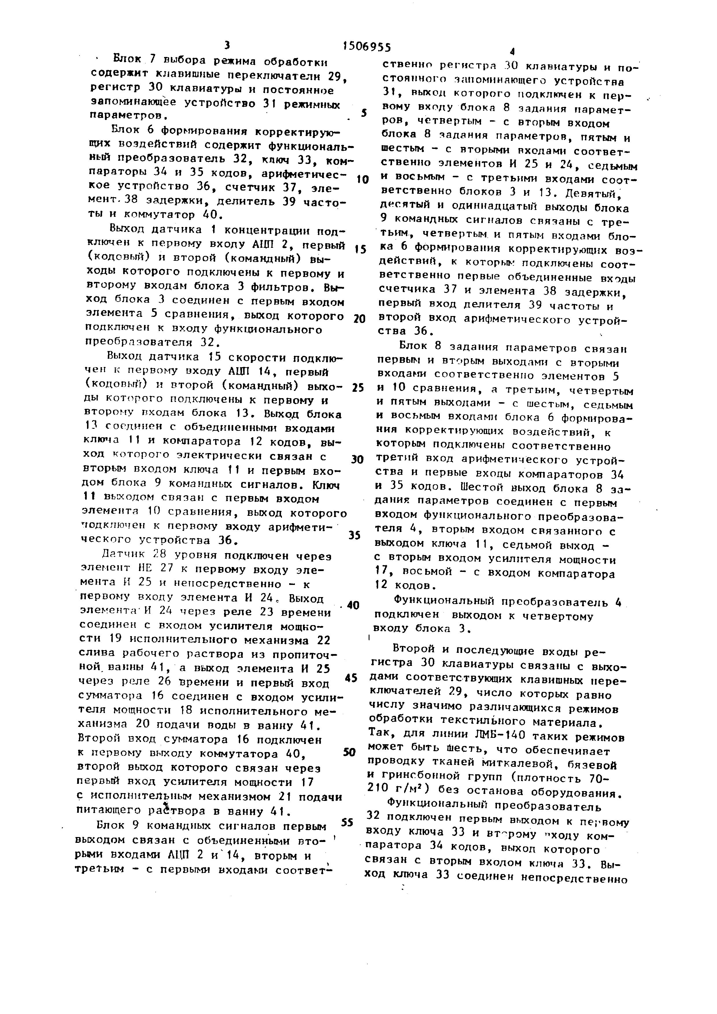 с выходом элемента 38 задержки, а четвертым - с выходом делителя 39 частоты- Датчики концентрации 1 и скорости движения 15 ткани могут быть по конструкции с выходным унифицированным