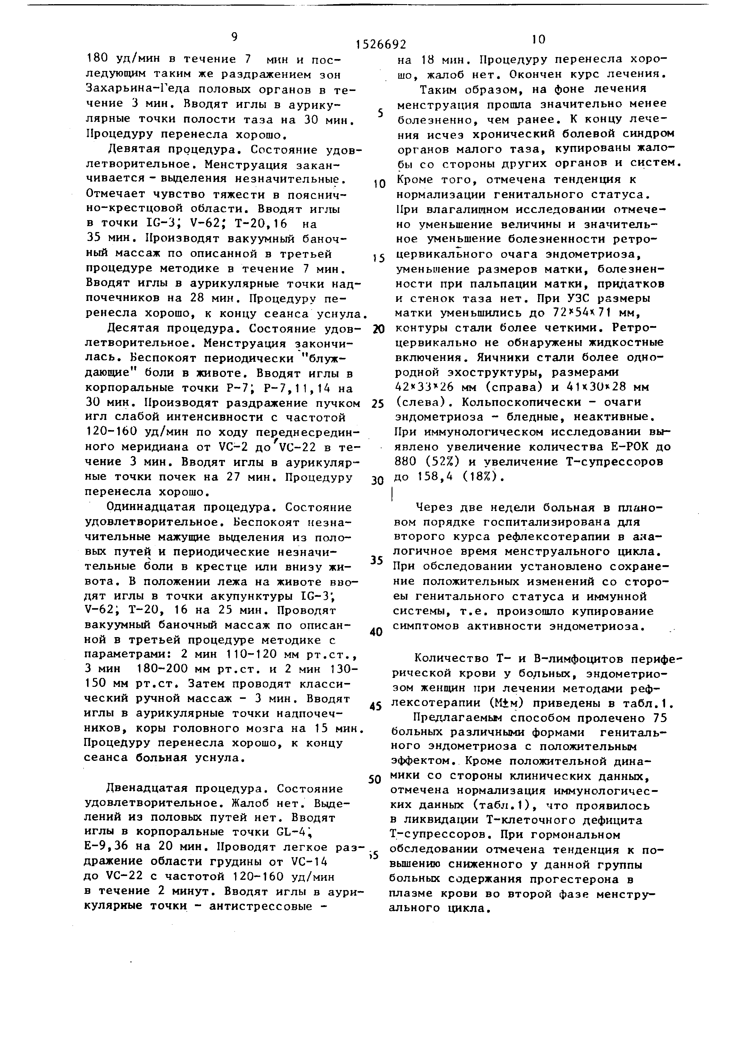 Изобретение относится к гинекологии. Цель изобретения - сокращение сроков лечения и предотвращения аллергических реакций при лечении генитального эндометриоза. Вводят иглы в симметричные корпоральные и аурикулярные точки акупунктуры с