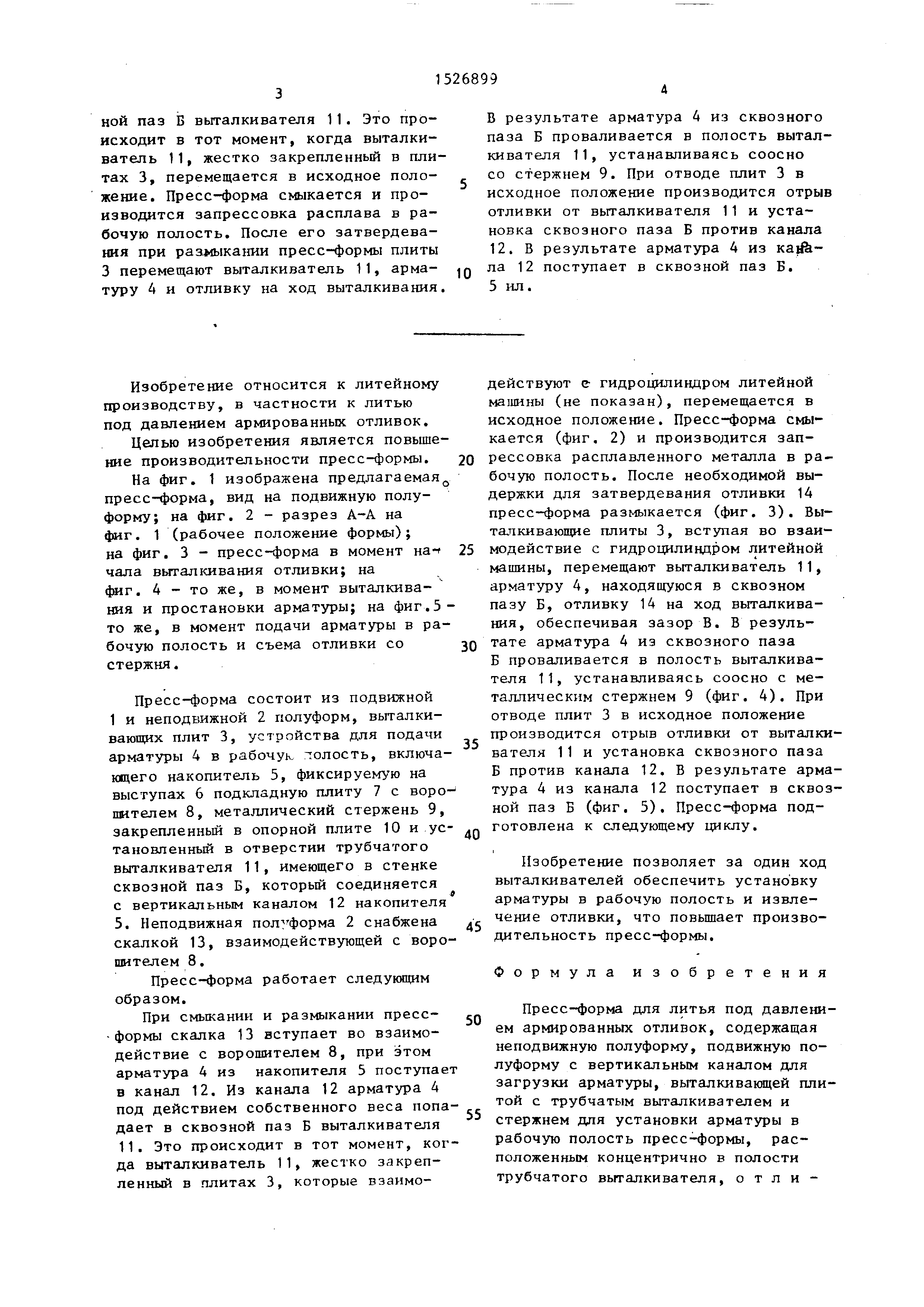 проваливается в полость выталкивателя 11, устанавливаясь соосно со стержнем 9. При отводе плит 3 в исходное положение производится отрыв отливки от выталкивателя 11 и установка сквозного паза Б против канала 12. В результате арматура 4 из канала 12