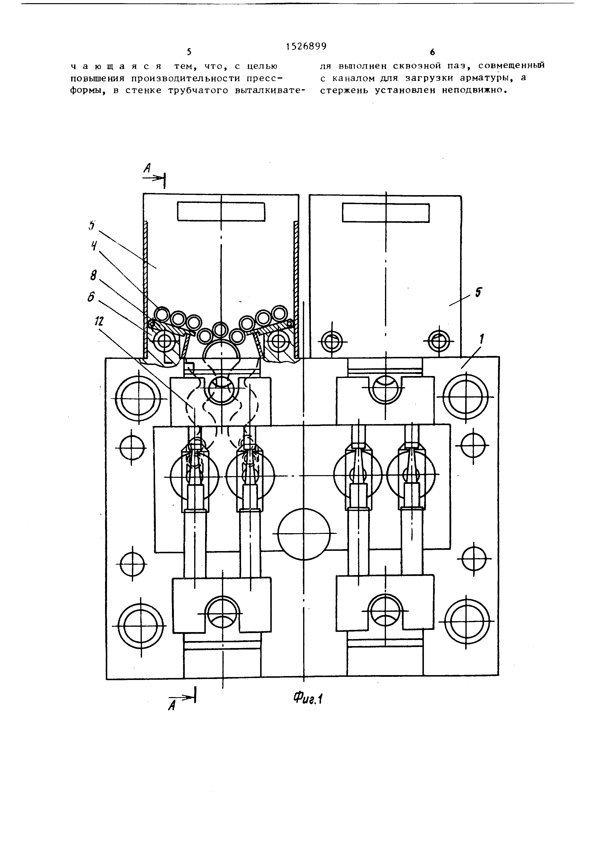 трубчатого выталкивателя, о т л и 51526899 чающаяся тем, что, с цельюля вьшолнен сквозной паз, совмещенный повышения производительности пресс-с каналом для загрузки арматуры, а формы, в стенке трубчатого выталкивате- стержень установлен неподвижно. /////////////// ч . 0W2.5 WTTT /////////////// Редактор С, Пекарь Составитель А.Соколов Техред И.Верес Заказ 7447/16 Тираж 711 ВНИИПИ Государственного комитета по изобретениям и открытиям при ГКНТ СССР