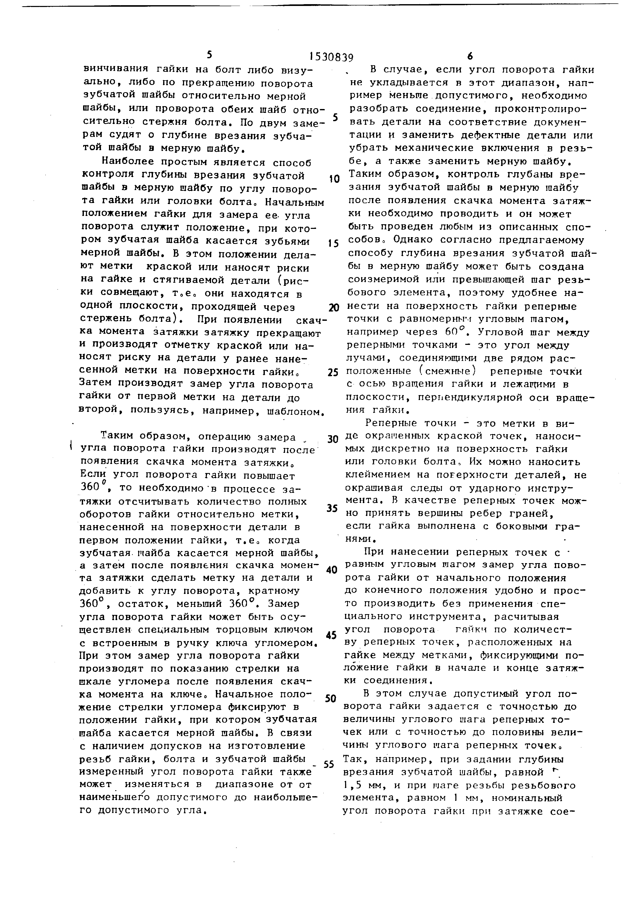 поверхности зубчатой шайбы. При достижении заданного усилия затяжки зубья врезаются на глубину, равную их высоте. Возрастает скачкообразно момент затяжки. Затяжку прекращают и производят контроль глубины врезания зубьев по углу поворота гайки.