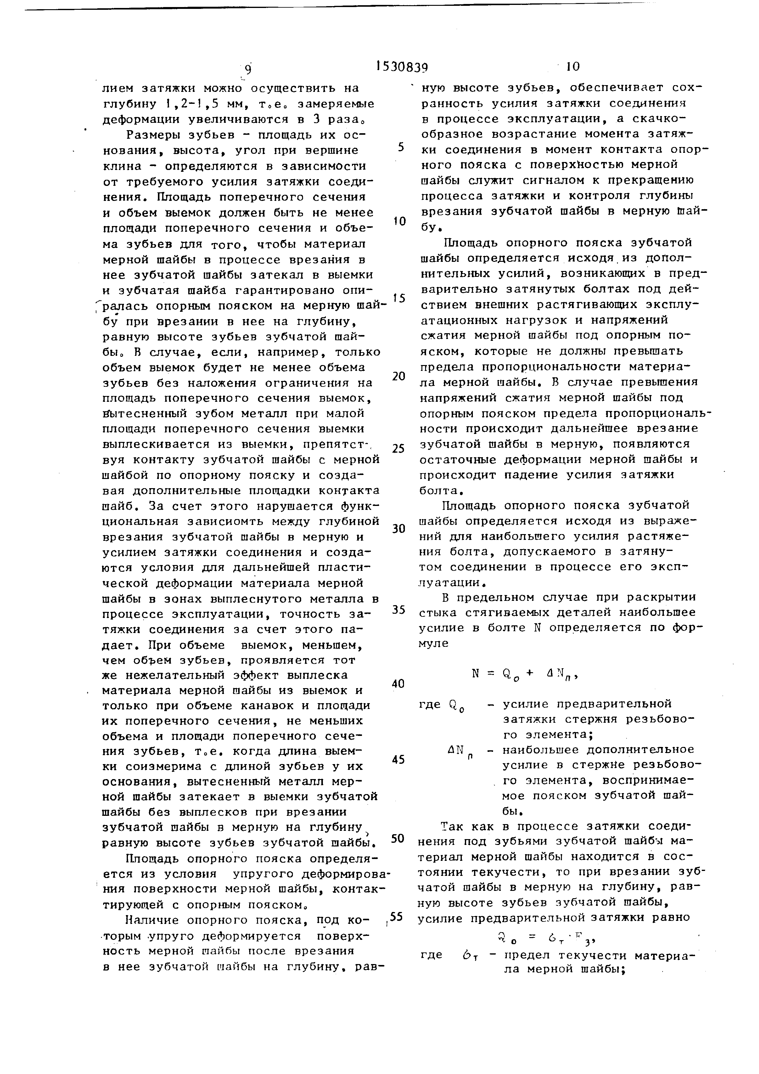 поверхности мерной шайбы, контактирующей с опорным ПОЯСКОМо 10 15 20 25 30 35 40 45 50 ную высоте зубьев, обеспечивает сох ранность усилия затяжки соединения