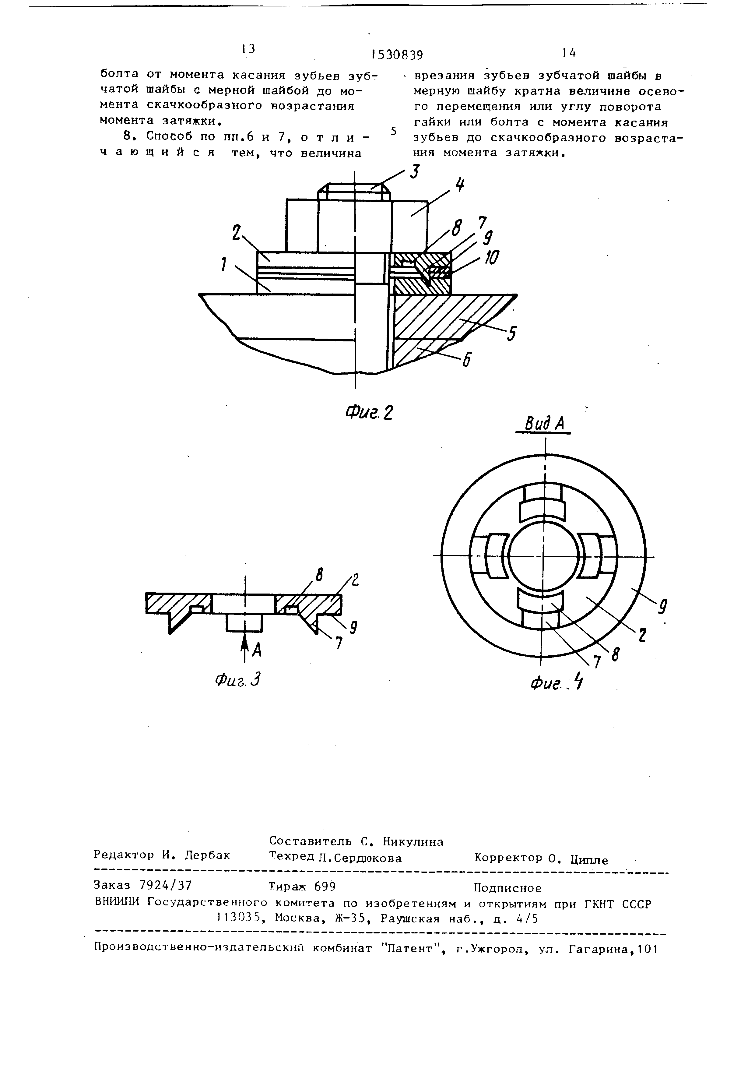 материал мерной шайбы 1 в выемки 8. При достижении заданного усили затяжки зубчатая шайба 2 врезается