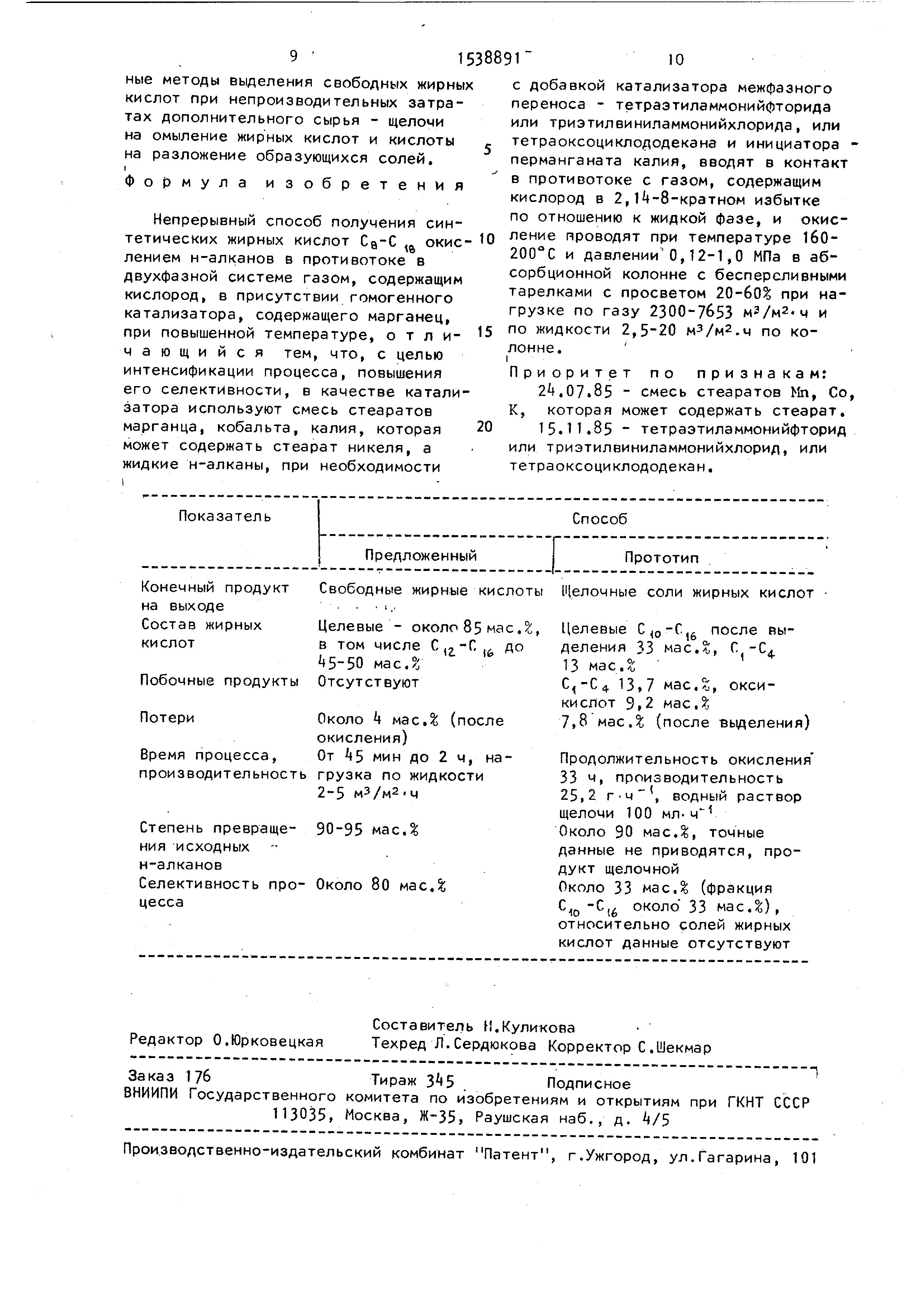 2,73 кг.ч (степень превращения 83,3%), целевых жирных кислот 1,912 кг. ч- (селективность около 70 масД по отношению к исходным н-алканам ) . Количество жирных кислот в конденсате 2,11 кг-ч- 1 (84 мае.;) при количестве