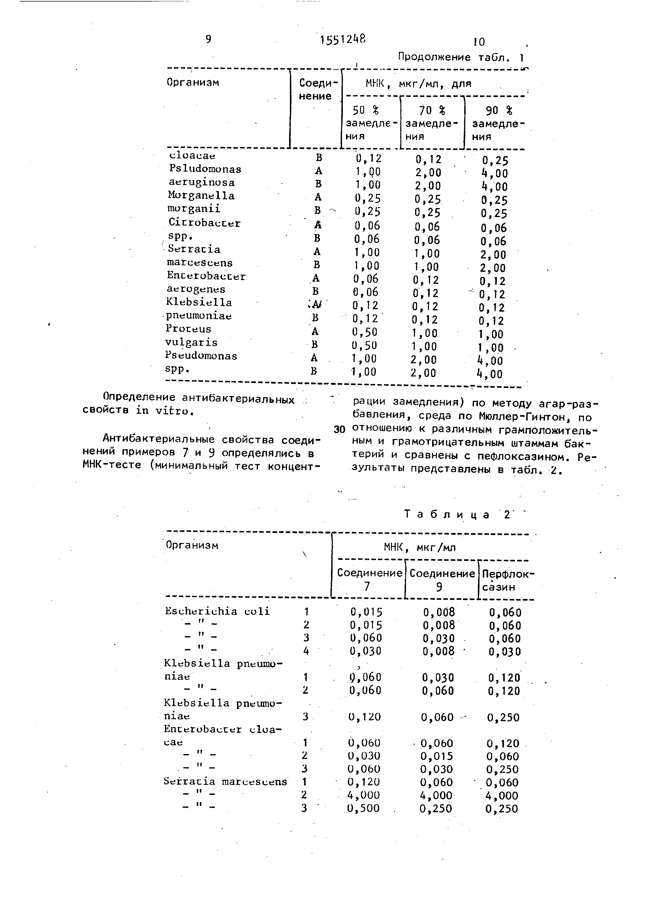 Как видно из габл. 1 и 2, предлагаемые соединения превосходят известные структурные аналоги по антибактериальному действию против различных штаммов бактерий.