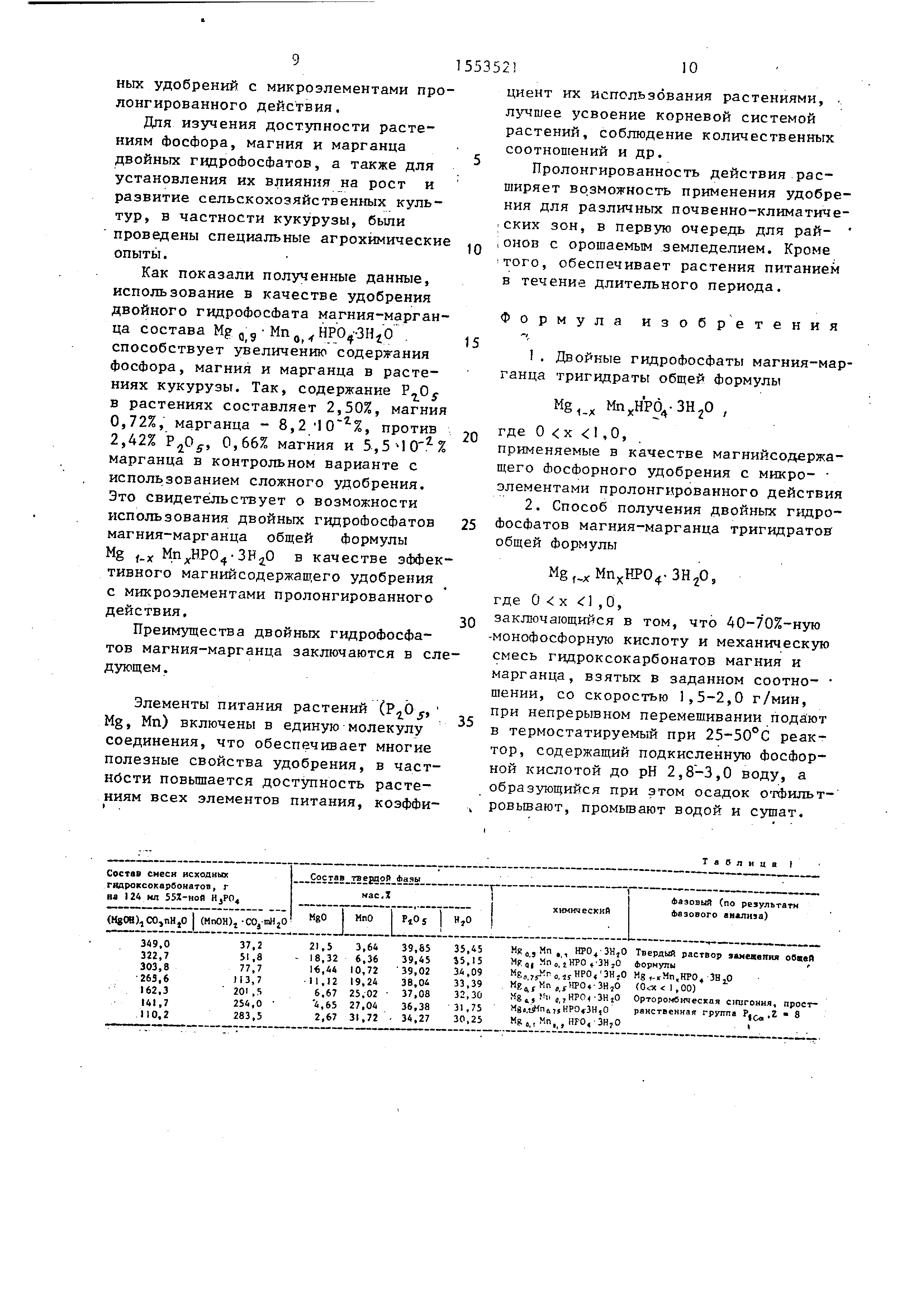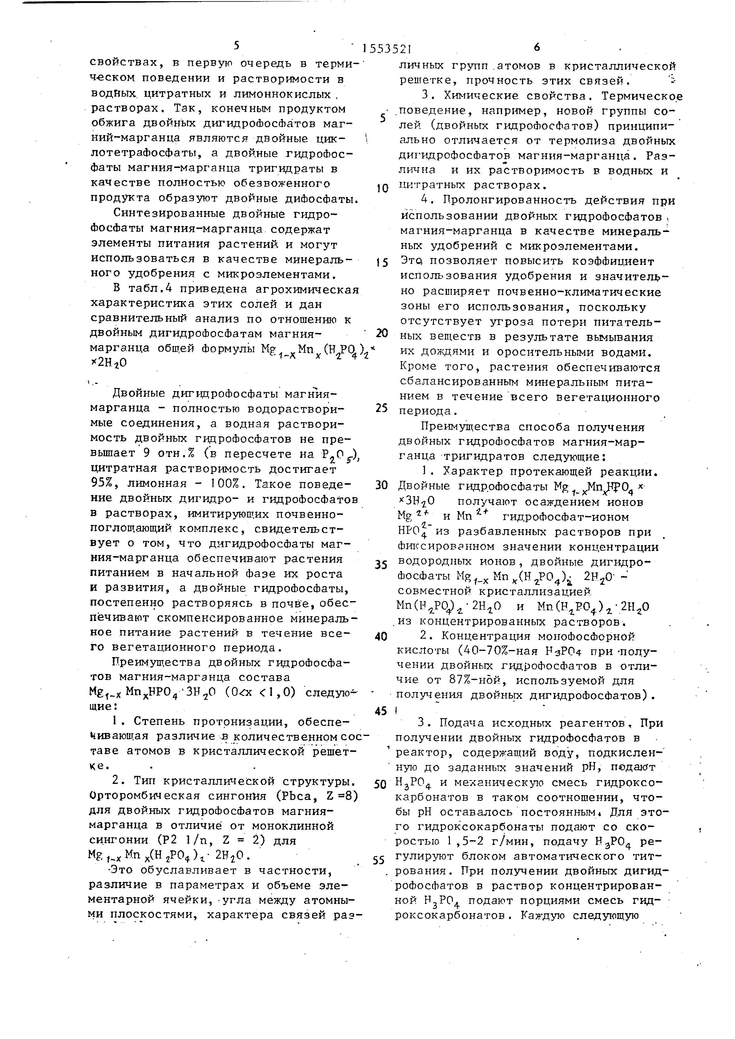 сбалансированным минеральным питанием в течение всего вегетационного периода. Преимущества способа получения двойных гидрофосфатов магния-марганца тригидратов следующие: 1.Характер протекающей реакции. Двойные гидрофосфаты Mg X3F20 получают осаждением ионов