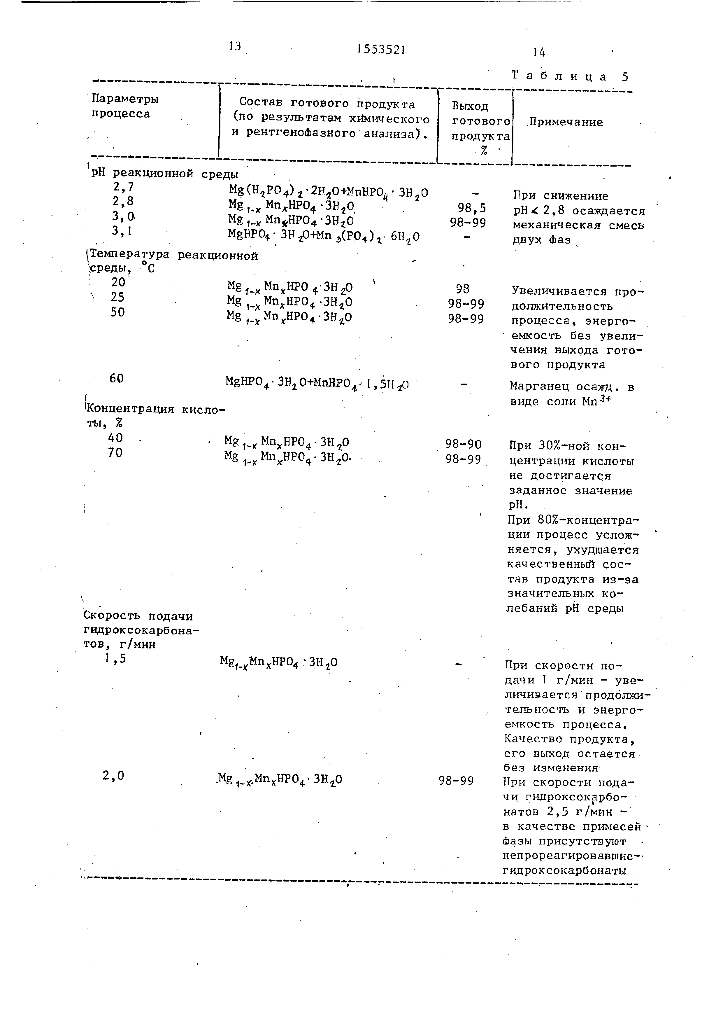 f Концентрация кислоты , % Мр. Mg 1-к ,хМпхНР04 Mgf yMnxHP04 -ЗН20 2,0 ..мп1(.зн1о Таблица 5 -При снижениие 98,,8 осаждается 98-99механическая смесь -двух фаз 98Увеличивается про98-99 должительность 98-99 процесса, энергоемкость