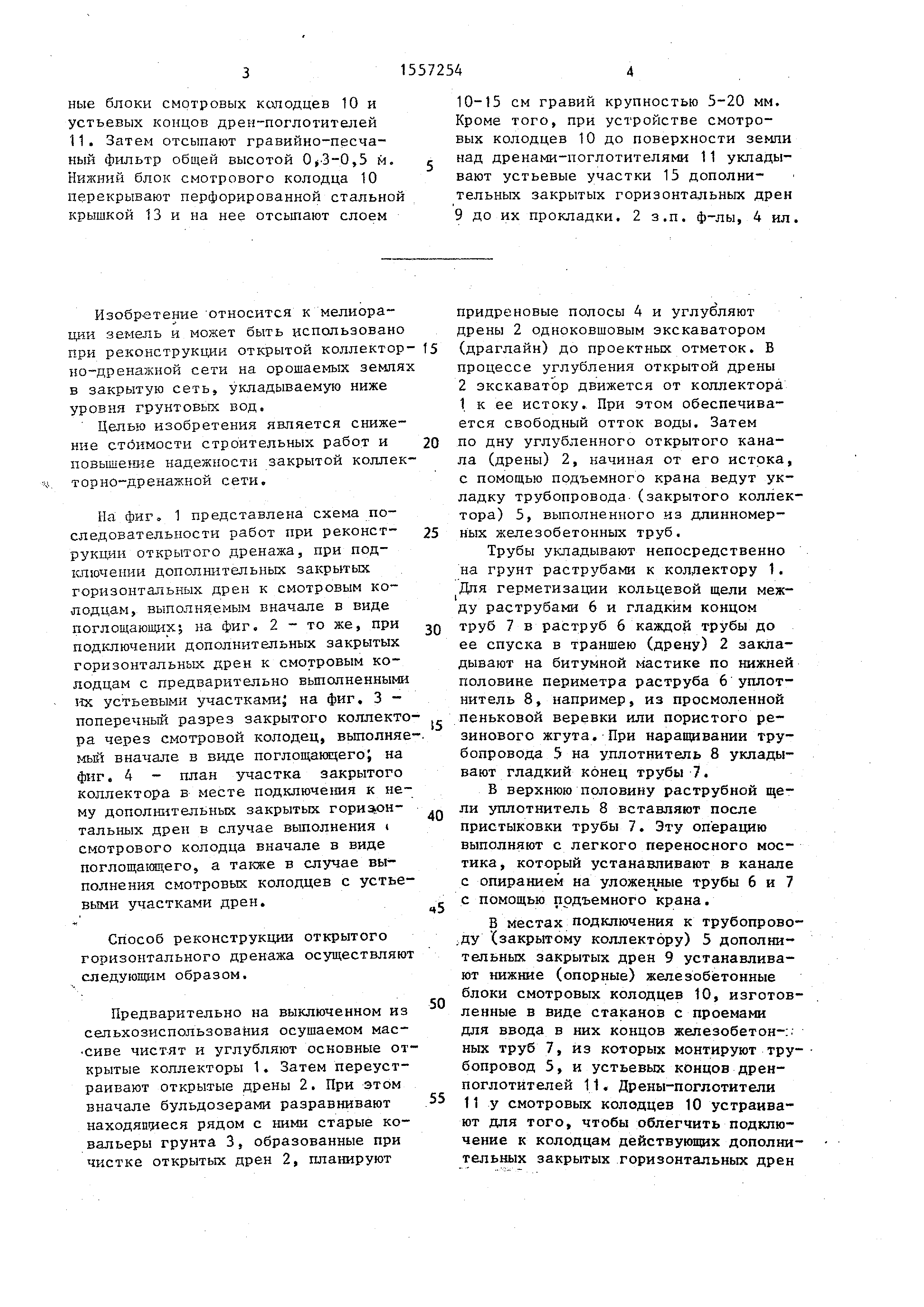 После этого открытые дрены засыпают. Формула изобретения 1. Способ реконструкции открытого горизонтального дренажа, включающий