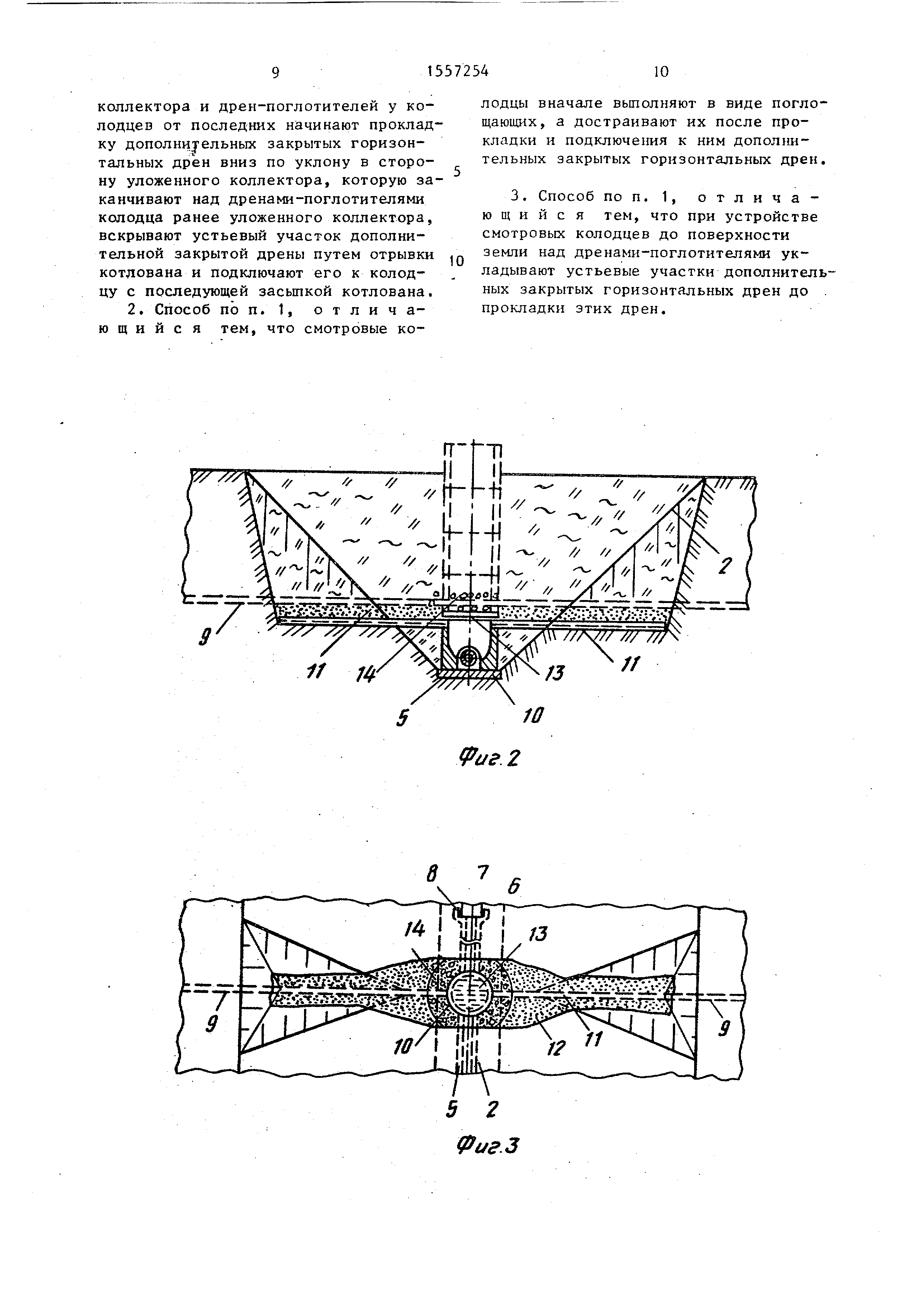 закрытые горизонтальные дрены 9 к их устьевым участкам 15. На заключительном этапе работ отстраивают смотровые колодцы 10 (монтируют на них оголовки с крышками)