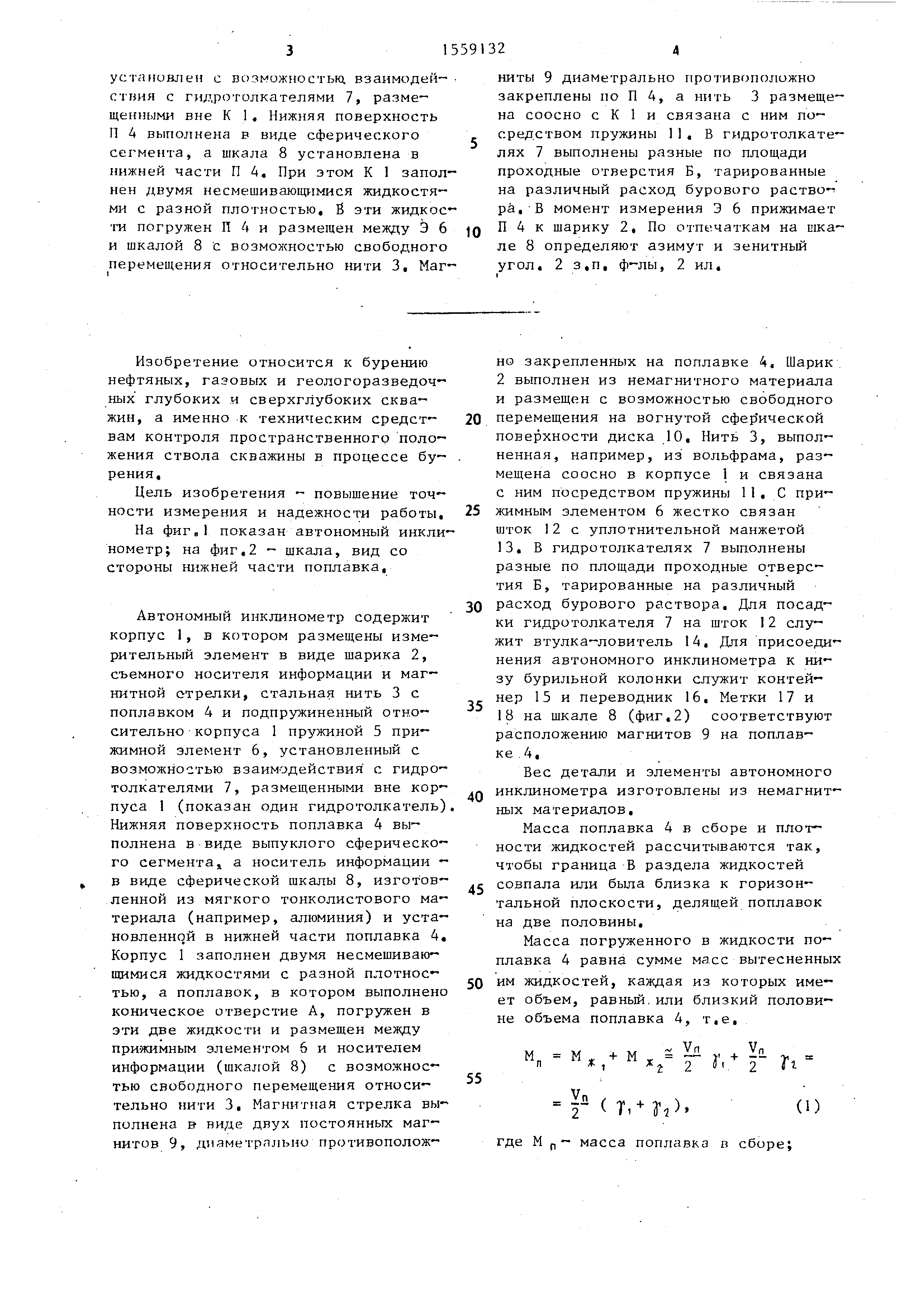 на различный расход вого раствора. 91 2. Инклинометр по п.1, о т л и- чающийся тем, что масса погруженного
