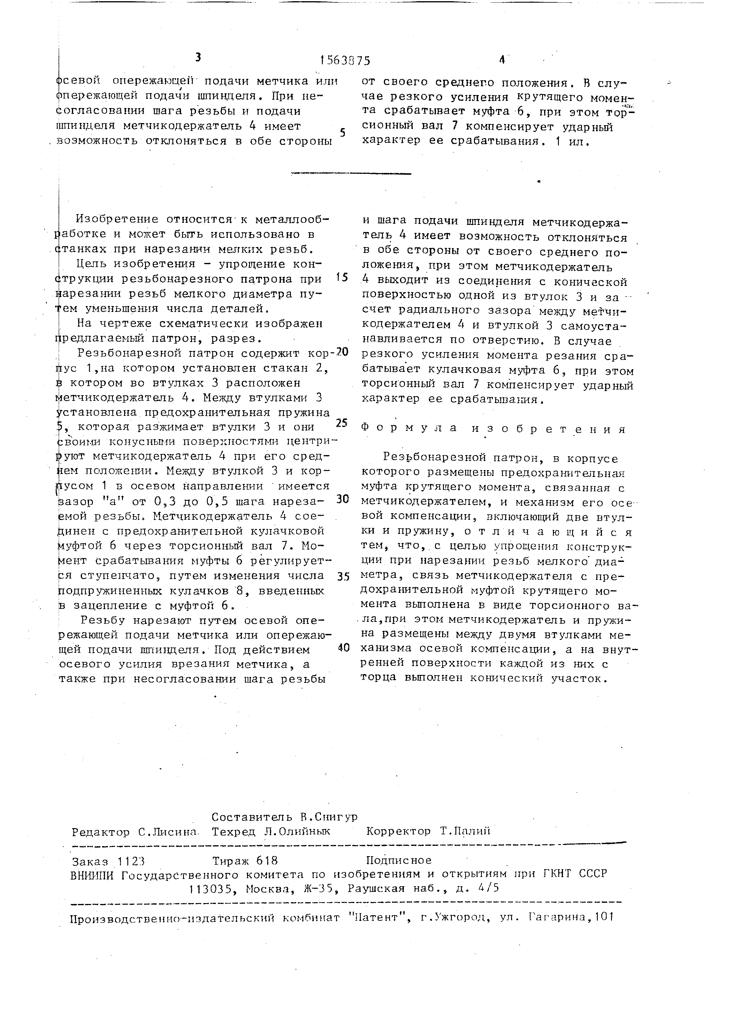 и может быть использовано в станках при нарезании мелких резьб. Цель изобретения - упрощение конструкции резьбонарезного патрона при нарезании резьб мелкого диаметра путем
