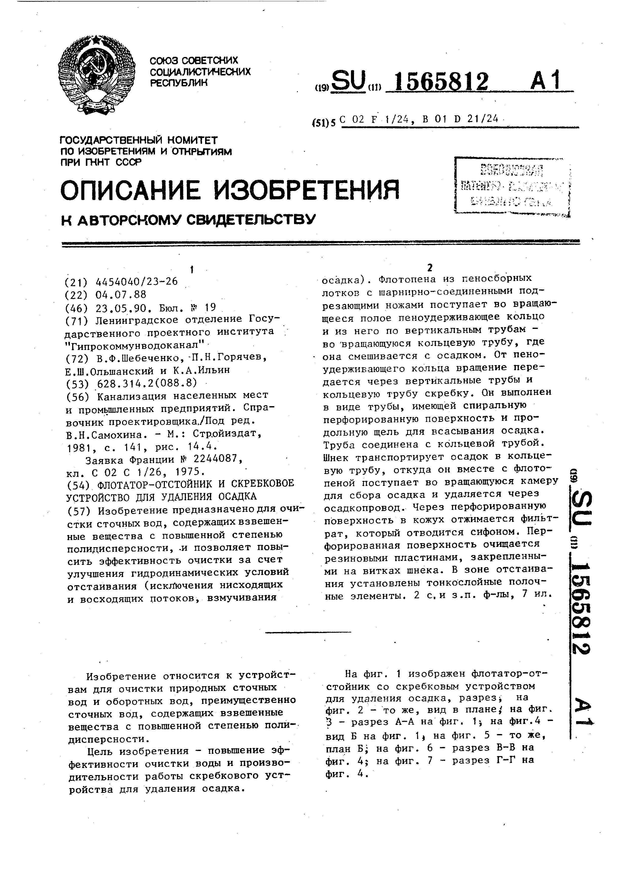 На фиг. 1 изображен флотатор-отстойник со скребковым устройством для удаления осадка, разрез, на фиг. 2 - то же, вид в плане, на фиг. 3 - разрез А-А на фиг. 1; на фиг.4 - вид Б на фиг. 1) на фиг. 5 - то же, план Б; на фиг. 6 - разрез В-В на фиг. 4; на фиг. 7 - разрез Г-Г на фиг. 4.