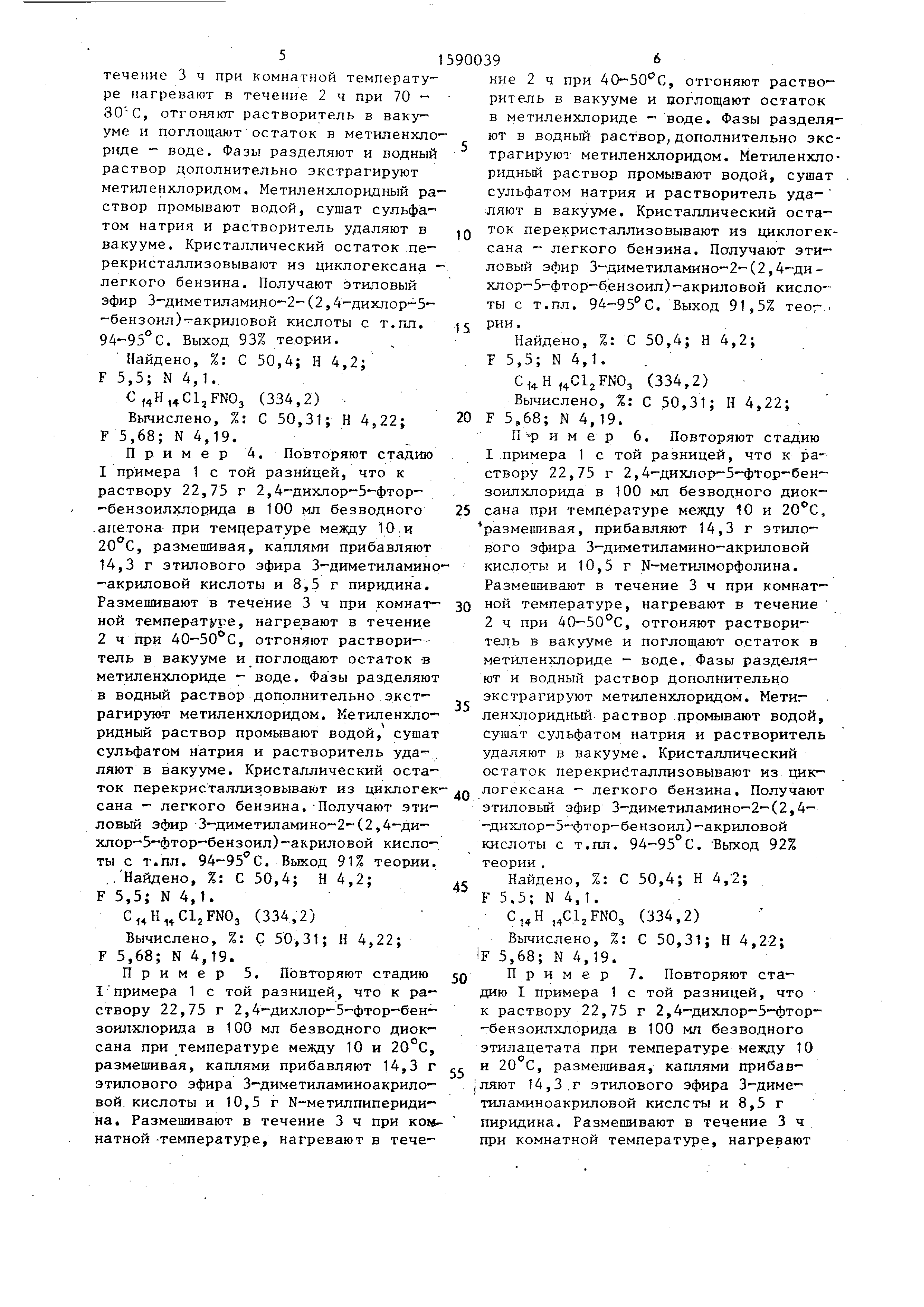 К раствору 4,5 г 2,4-дихлор-5-фтор- -бензоилхлорида в 40 мл безводного диоксана при температуре между 10 и 20°С, размешивая, каплями прибавляют 3,4 г метилового эфира 3-(1-морфоли- нил)-акриловой кислоты и 2,5 г три- этиламина. Размешивают в течение 3 ч при комнатной температуре, нагревают в течение 2 ч при 70-80 С, отгоняют . растворитель в вакууме и поглощают остаток в метиленхлориде - воде. Фазы разделяют и водный раствор дополнительно экстрагируют метиленхлори- дом. Метиленхлоридный раствор промывают водой, сушат сульфатом натрия и растворитель удаляют в вакууме. Кристаллический остаток перекристаллизовывают из метанола. Получают 6,6 г (92% теории) метилового эфира 3-(1-морфо- линил)-2-(2,4-дихлор-5-фтор-бензоил)- -акриловой кислоты с т.пл. 120-12I C. С ,5-11 „CljFNO (362,2).