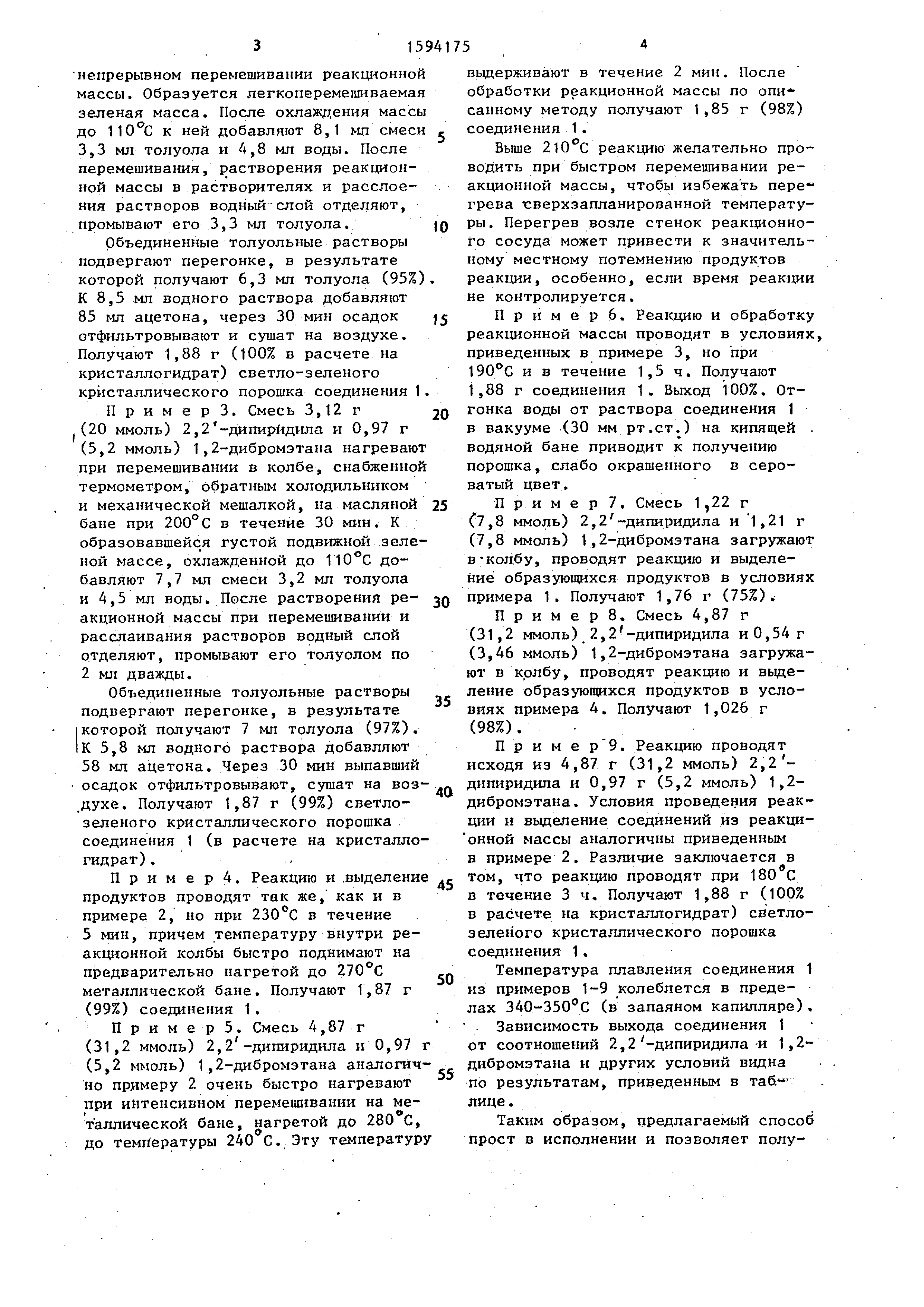 Пример 1. Смесь 1,22 г (7,8 ммоль) 2,2 -дипиридала и 0,97 г (5,2 ммоль) 1,2-дибромэтана нагревают в колбе, снабженной термометром и обратным холодильником, на масляной бане. Постепенно в течение 2 ч температуру поднимают до и поддерживают на этом уровне 8 ч. В колбе образуется очень густая неперемешивающаяся зеленая масса. К этой массе после охлаждения до добавляют 2,7 мл смеси 1,1 мл толуола и 1,6 мл