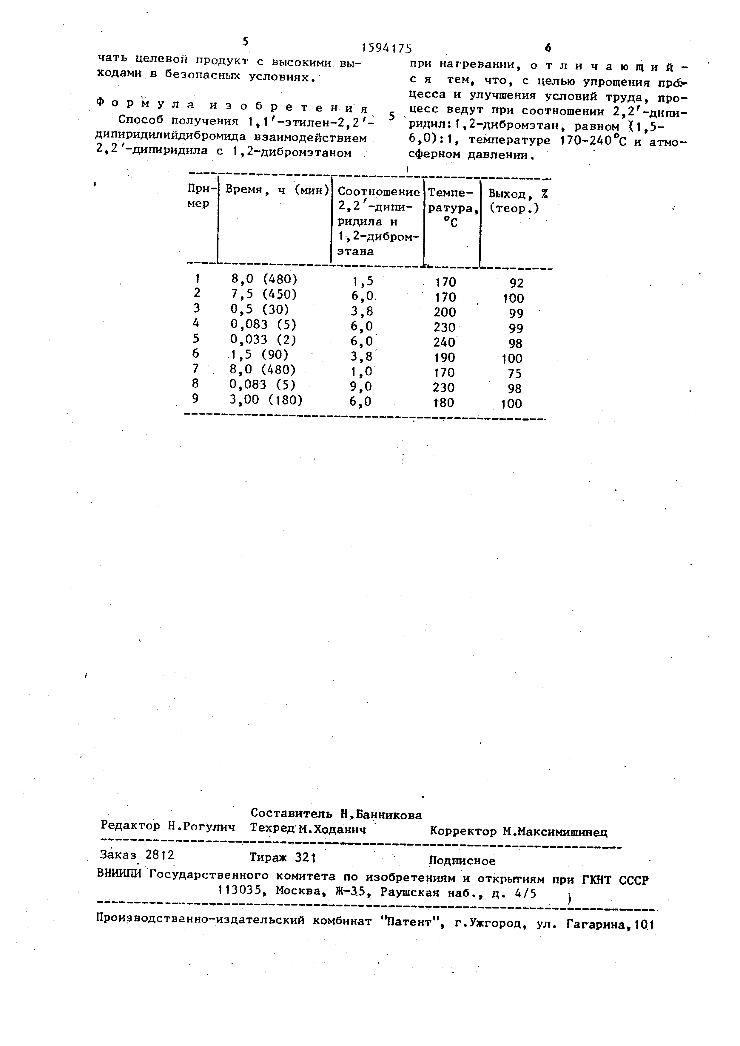 П р и м е р 9. Реакцию проводят исходя из 4,87 г (31,2 ммоль) 2,2- дипиридила н 0,97 г (5,2 ммоль) 1,2- дибромэтана. Условия проведения реак- и вьщеление соединений из реакци- онной массы аналогичны приведенным в примере 2. Различие заключается в П р и м е р 4. Реакцию и .выделение ., том, что реакцию проводят при 180 С