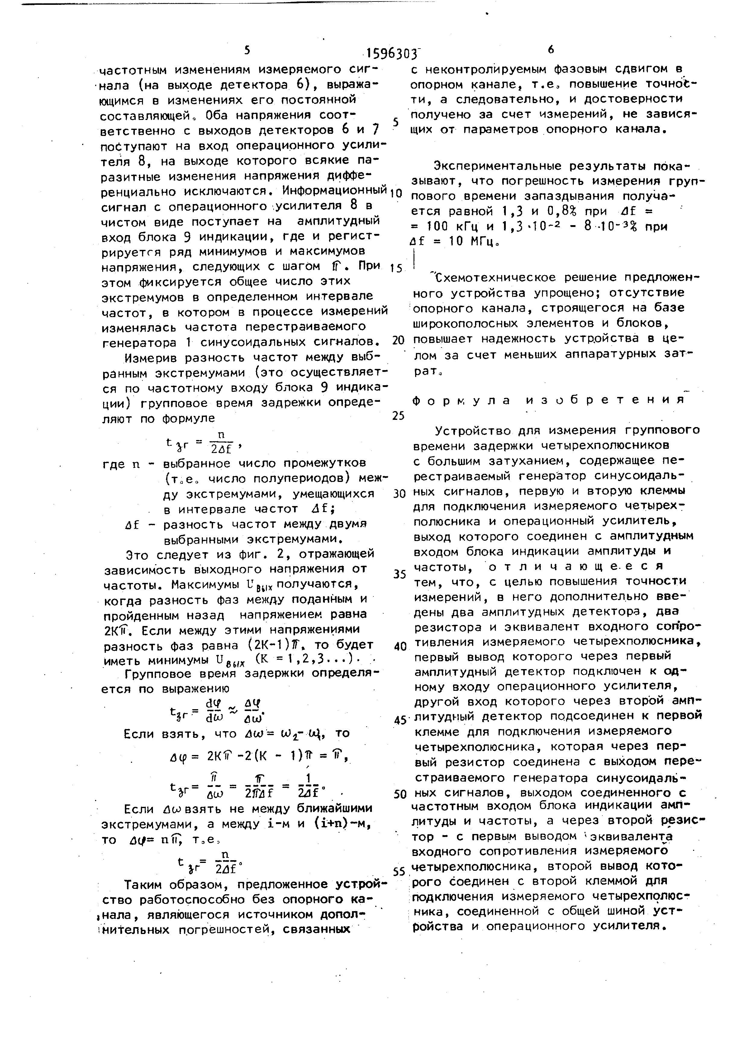 Изобретение может быть использовано для измерения группового времени четырехполюсников, имеющих большое затухание, в частности линий задержки и фильтров на ПАВ. Цель изобретения - повышение точности измерений. Устройство содержит