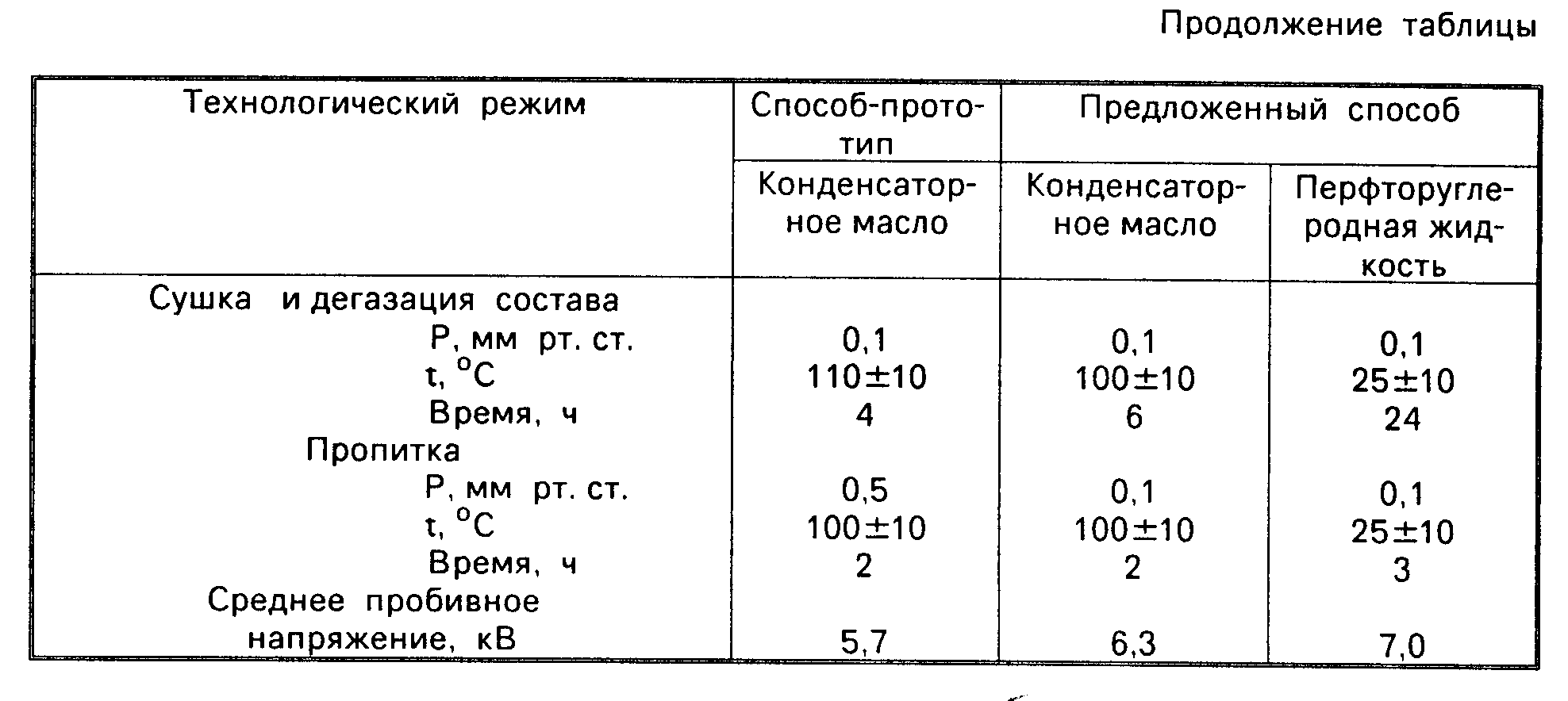 качестве пропитывающего состава использовали конденсаторное масло, а во втором перфторуглеродную жидкость. Технологические режимы по предложенному способу и по способу-прототипу указаны в таблице, где