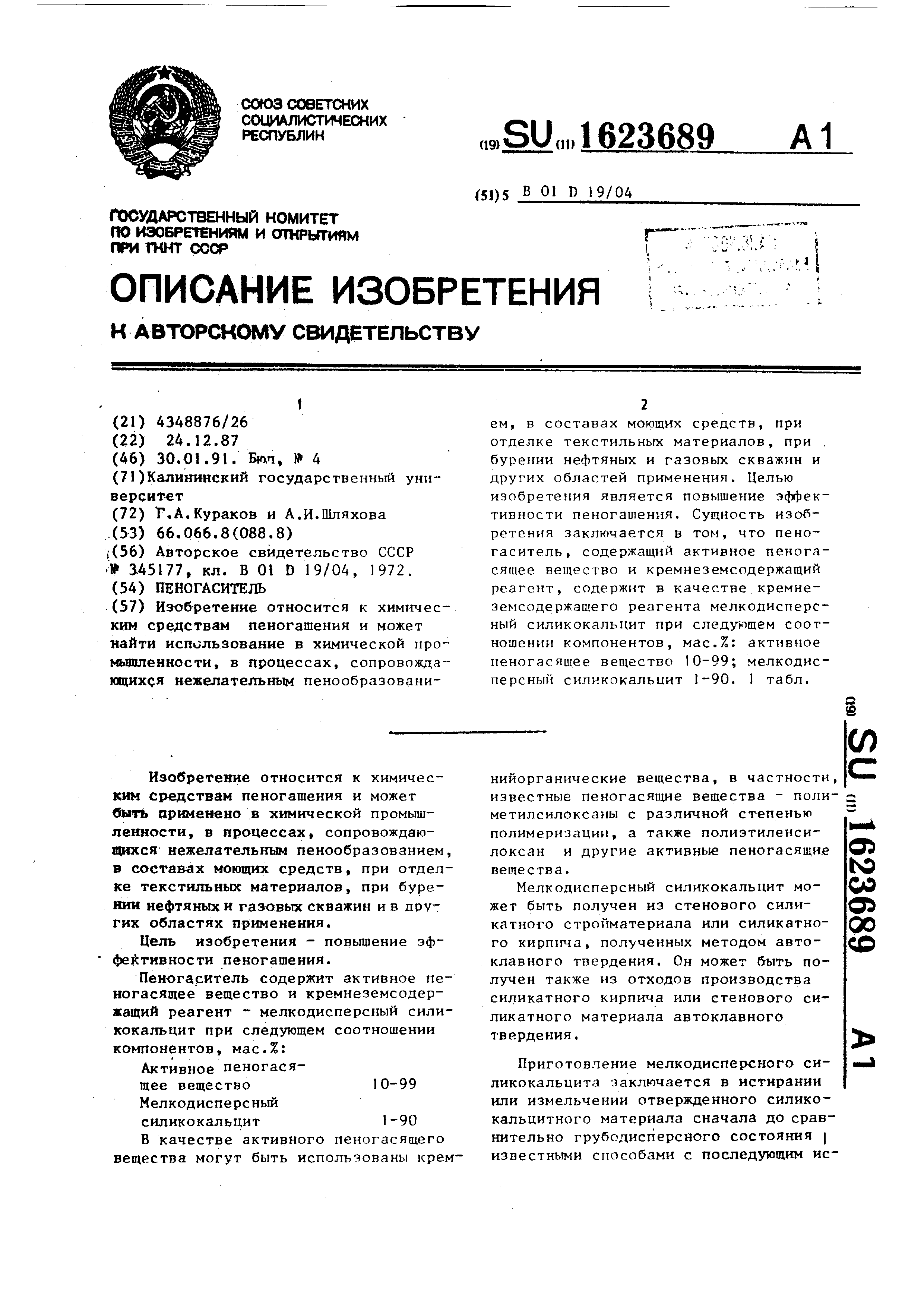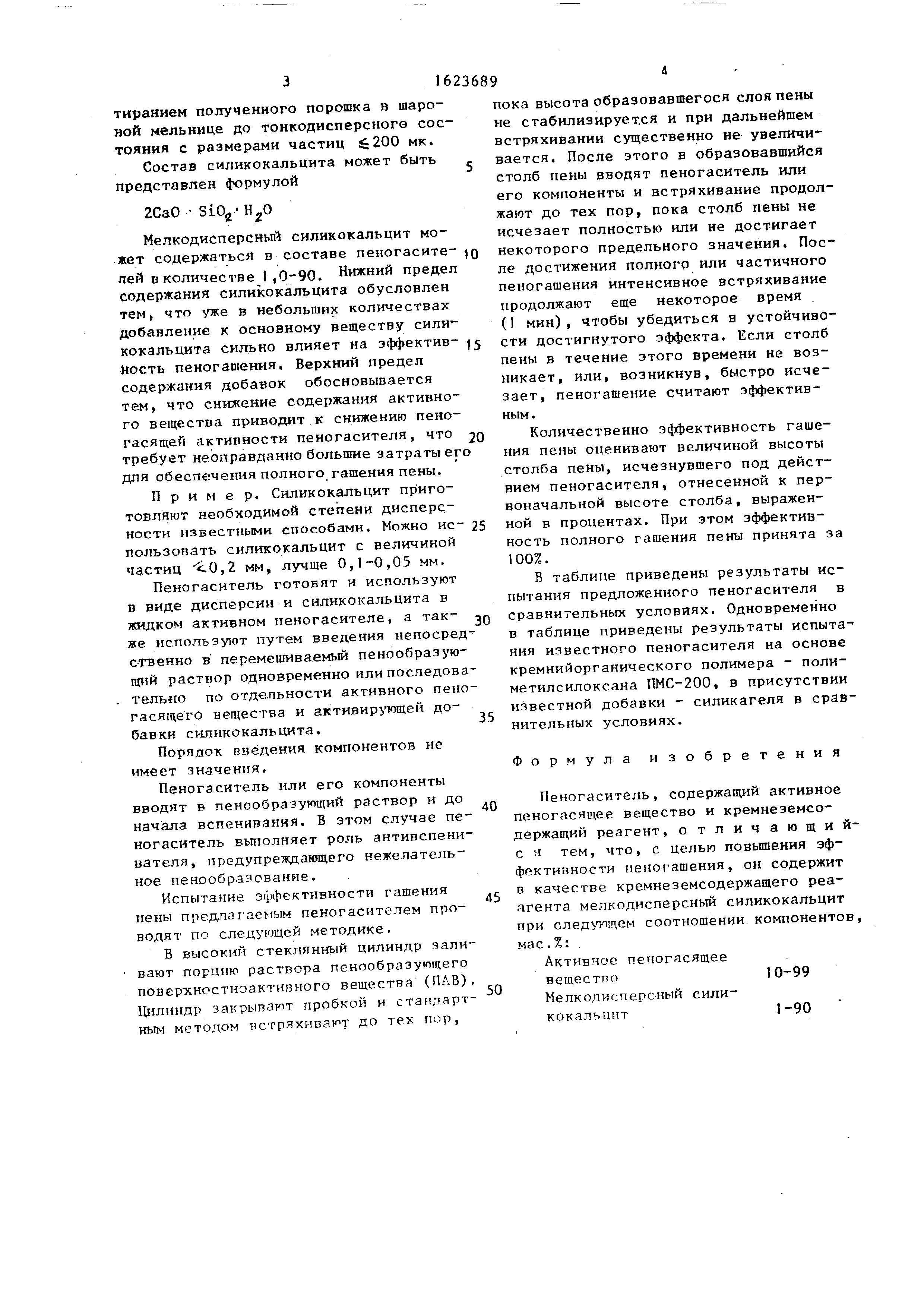жащий реагент - мелкодисперсный сили- кокальцит при следующем соотношении компонентов, мас.%: Активное пеногасящее вещество10-99 Мелкодисперсный силикокальцит1-90 В качестве активного пеногасящего