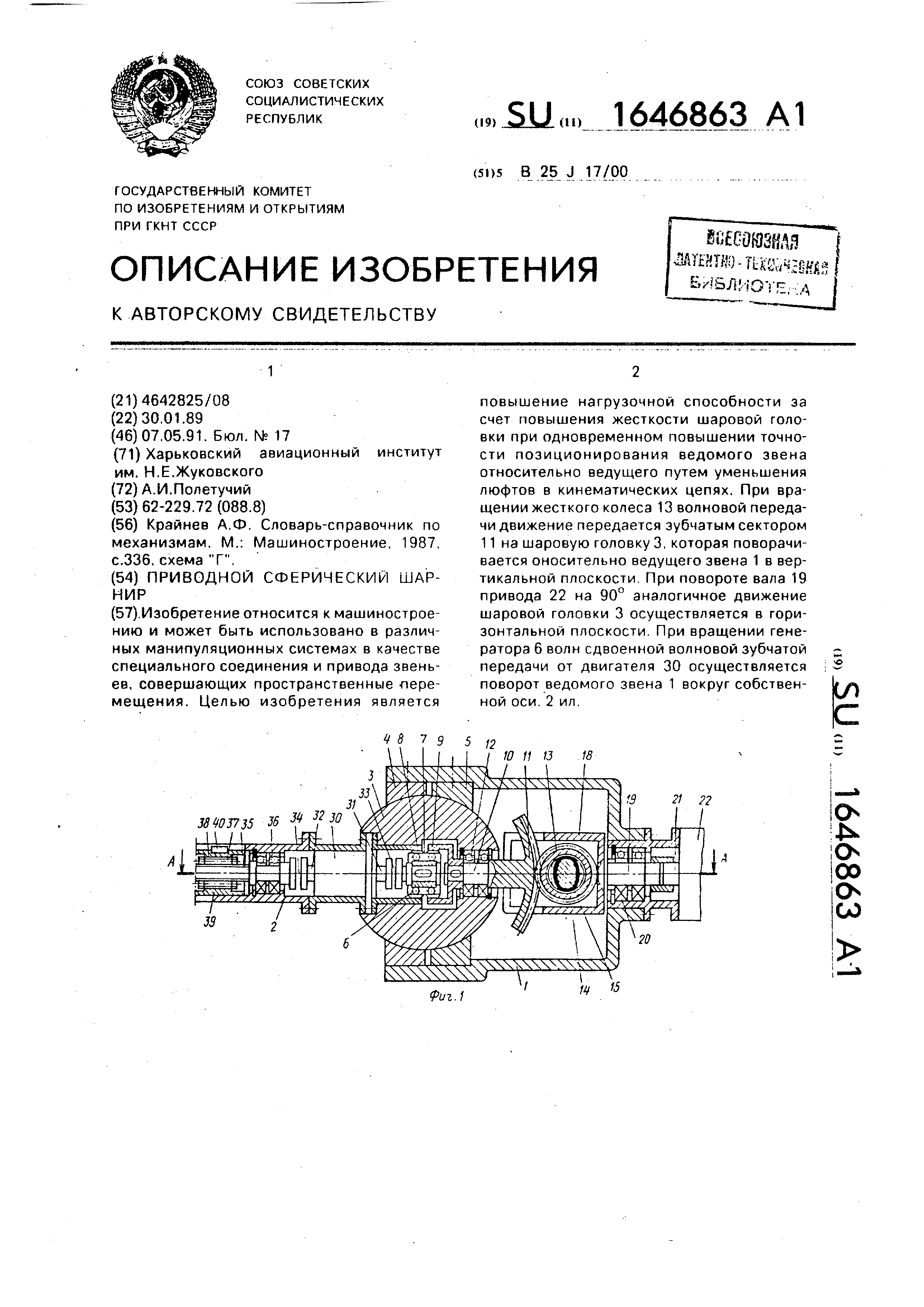 звене 1 и имеющего аналогичную,сдвоенную волновую зубчатую передачу (не показана ). К подвижной направляющей 18 неподвижно прикреплено гибкое колесо 14 и