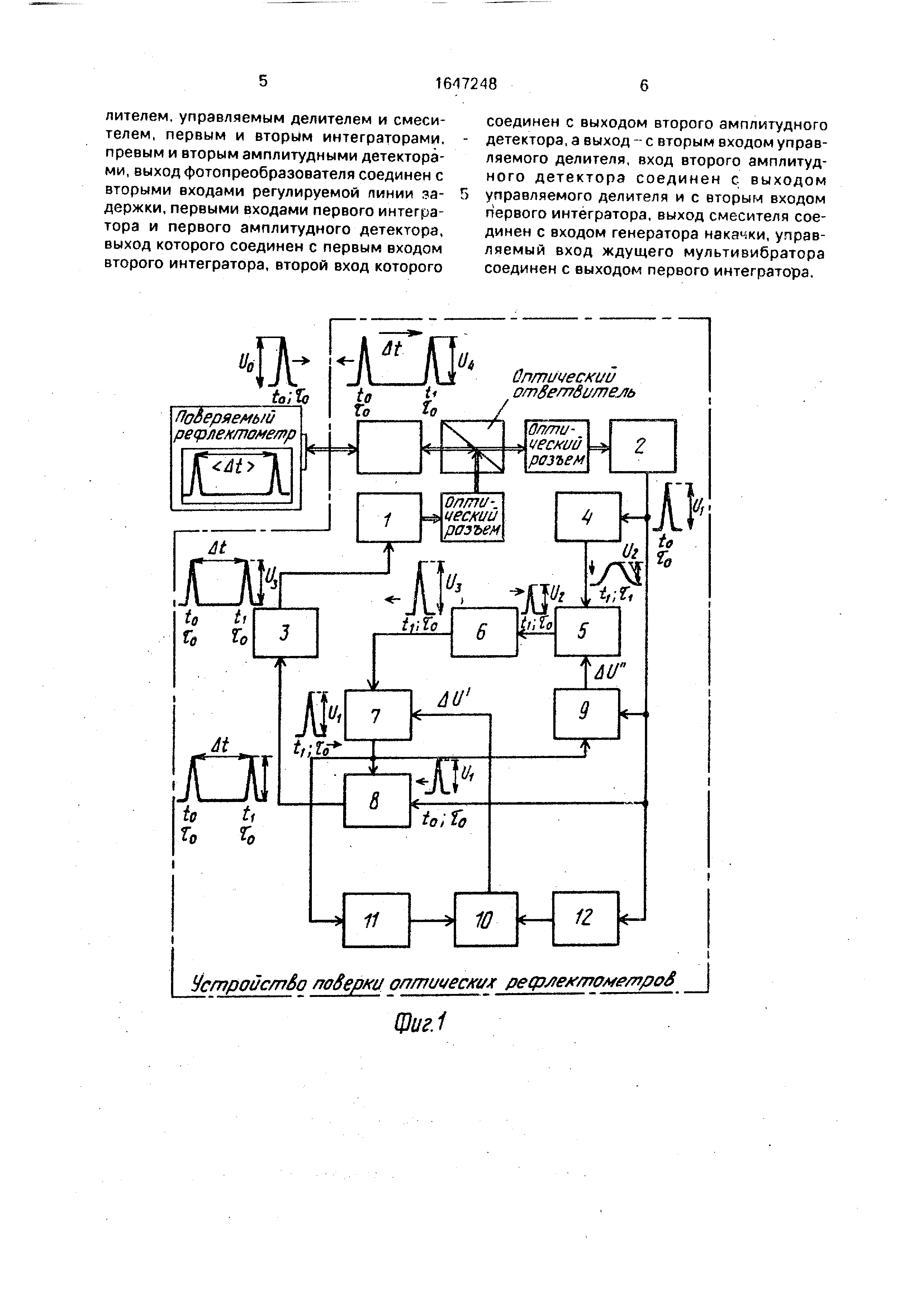 ждущего мальтивибратора 5 - с выходом первого интегратора 9. Устройство, реализующее способ, работает следующим образом. Оптический импульс, взятый от поверяемого рефлектометра, задающий началь- ный момент времени t0 и имеющий