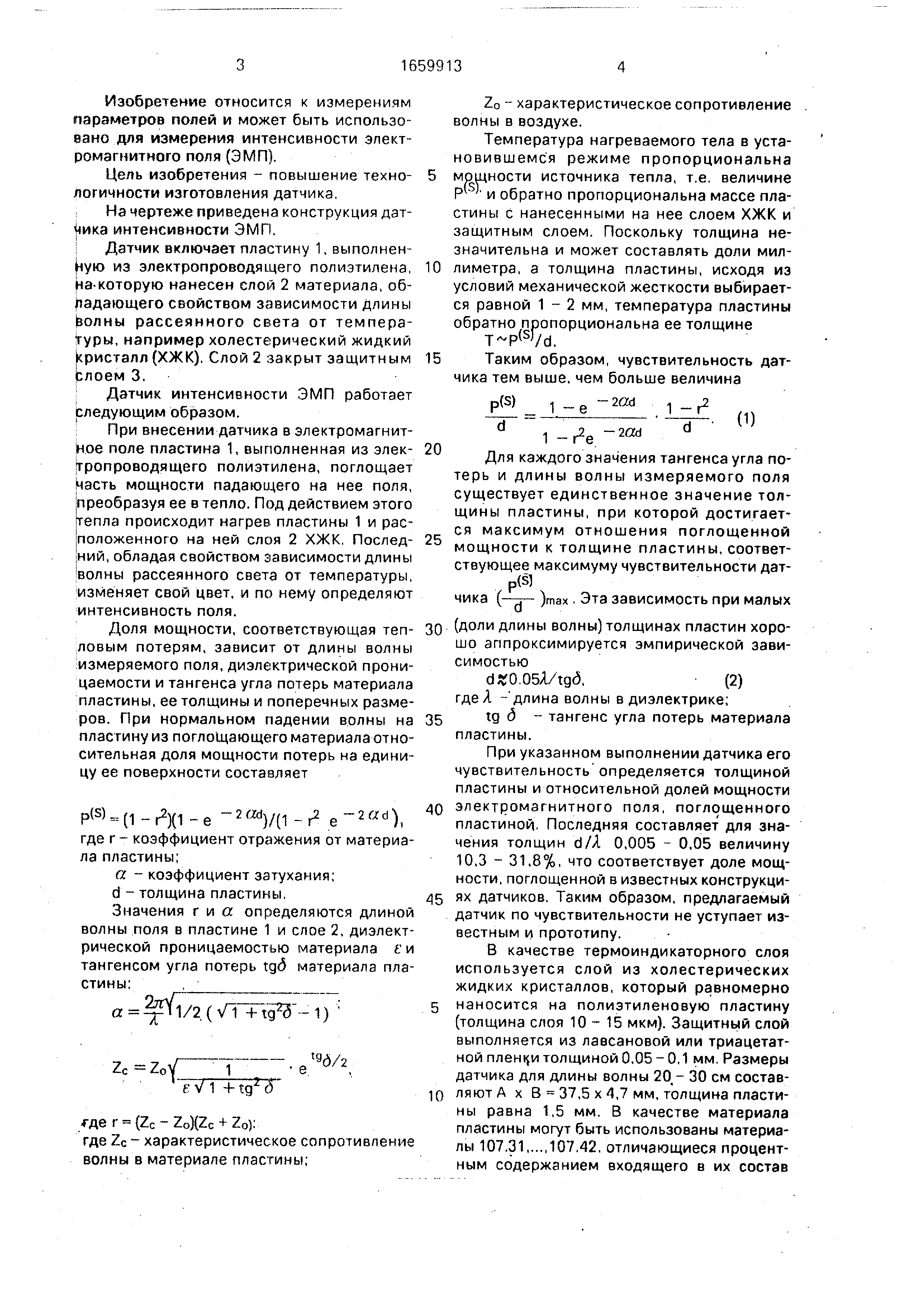 tgd . Выбор конкретного материала производится в зависимости от длины волны измеряемого поля. Предлагаемый датчик характеризуется более высокой технологичностью по сравнению
