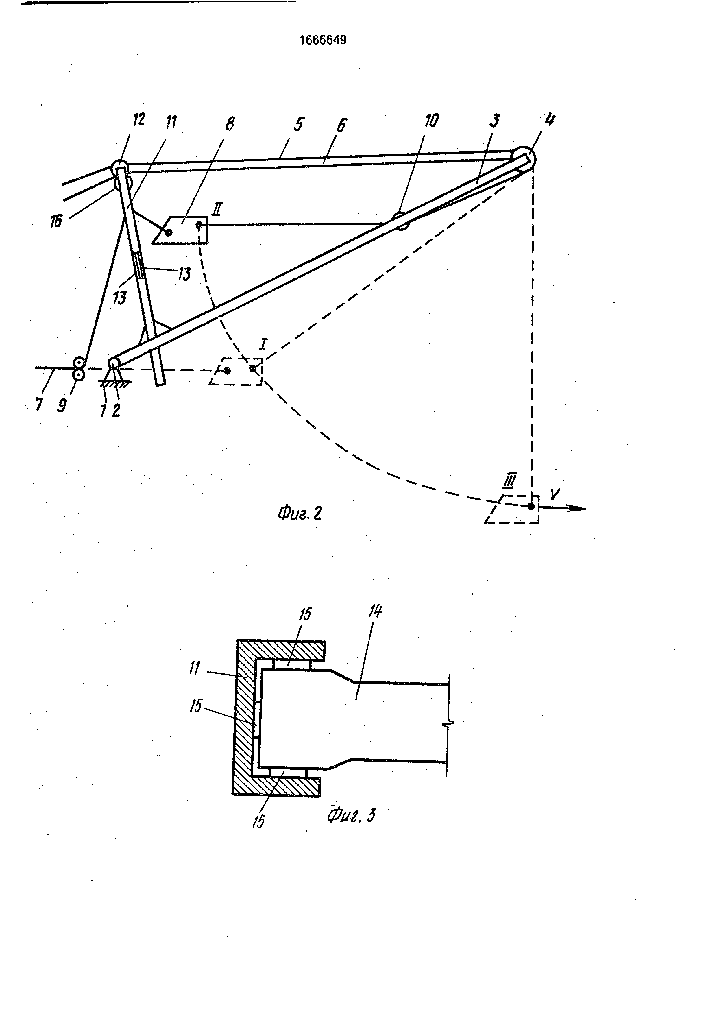 часть балок 3 имеет ролик в виде двух усеченных конусов, соединенных вершинами. Ролик расположен с возможностью взаимодействия с тяговым канатом (К) 7. Механизм заброса ковша 8 выполнен из вертикальной П-образной рамы 11 с направляющими 13. Тележка