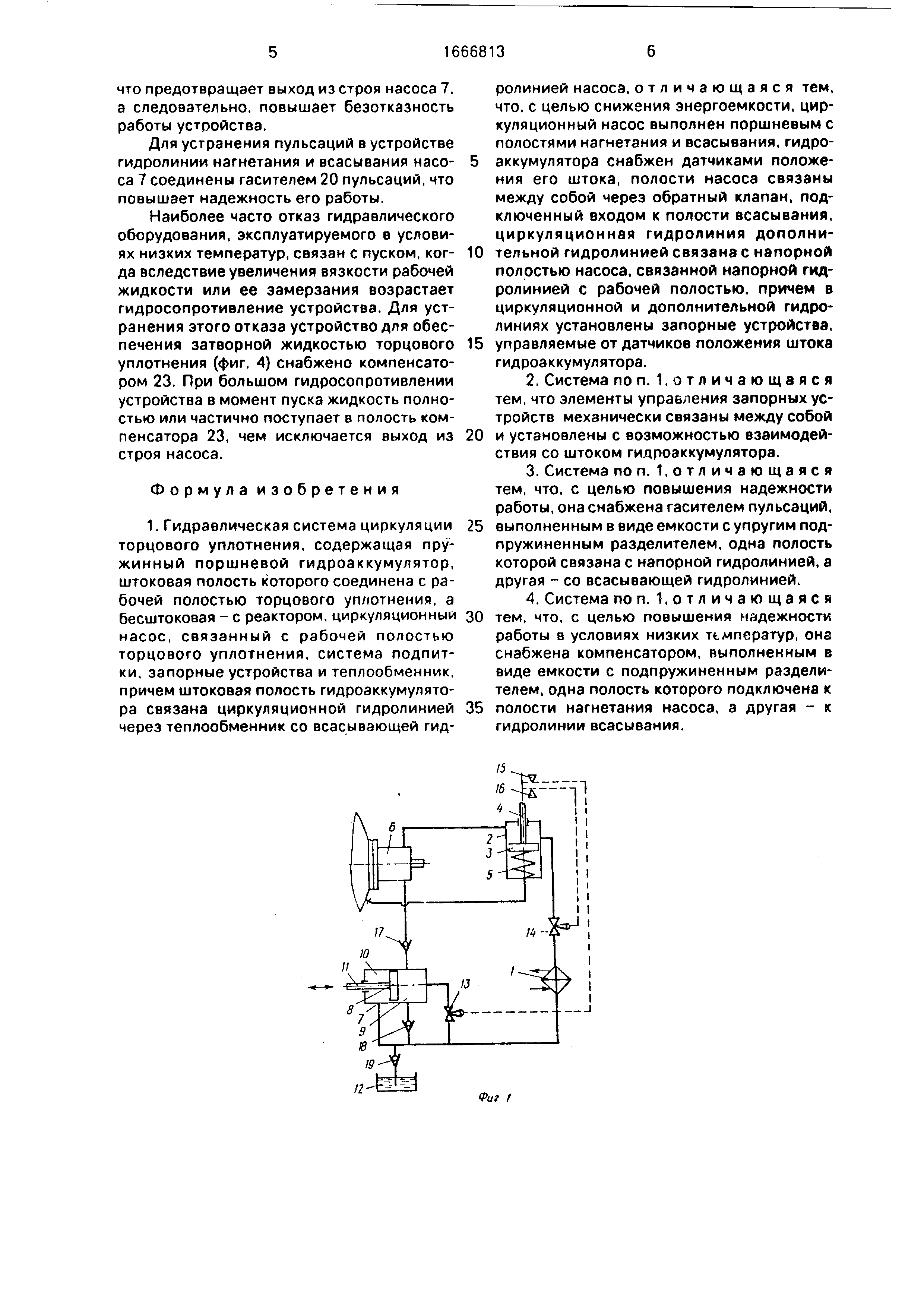 система с компенсатором, на фиг. 6 - гидравлическая система, пример выполнения торцового уплотнения. Гидравлическая система циркуляции торцового уплотнения (фиг 1)содержит теплообменник 1, пружинный поршневой гидроаккумулятор 2, представляющий собой дифференциальный цилиндр с поршнем 3,