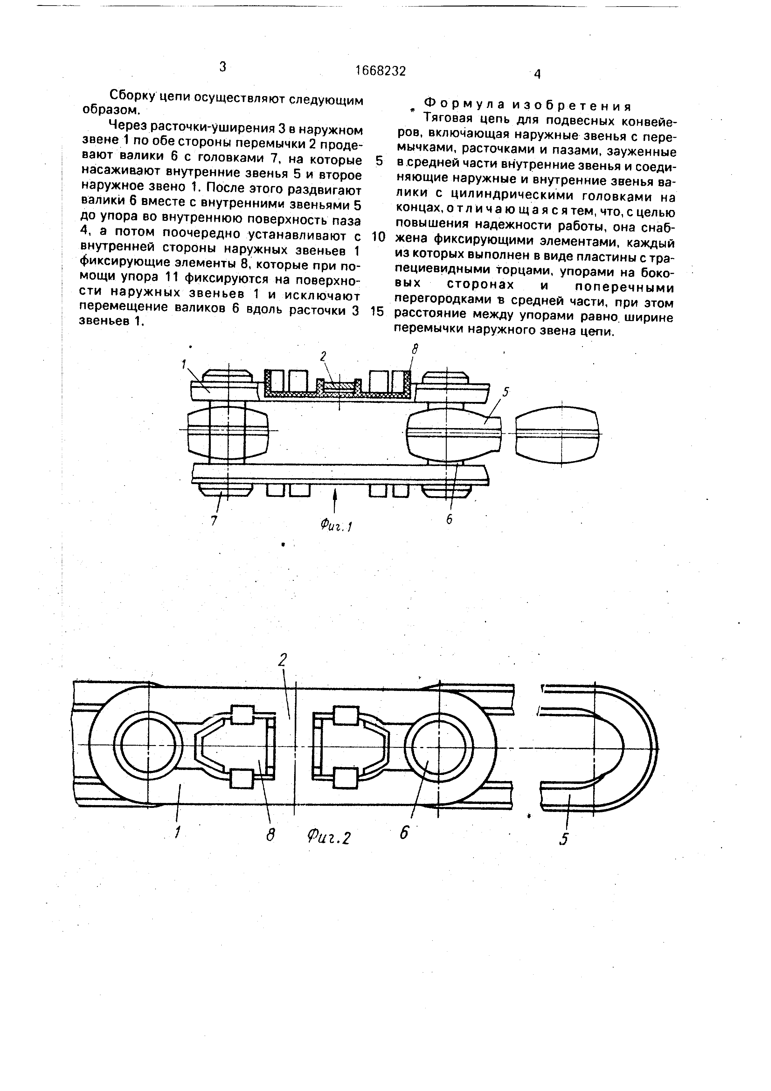 валики 6 с цилиндрическими головками 7. Цепь снабжена фиксирующими элементами 8, каждый из которых выполнен в виде пластины с трапециевидными торцами, упорами на боковых сторонах и поперечными перегородками 6 средней части. При этом расстояние между