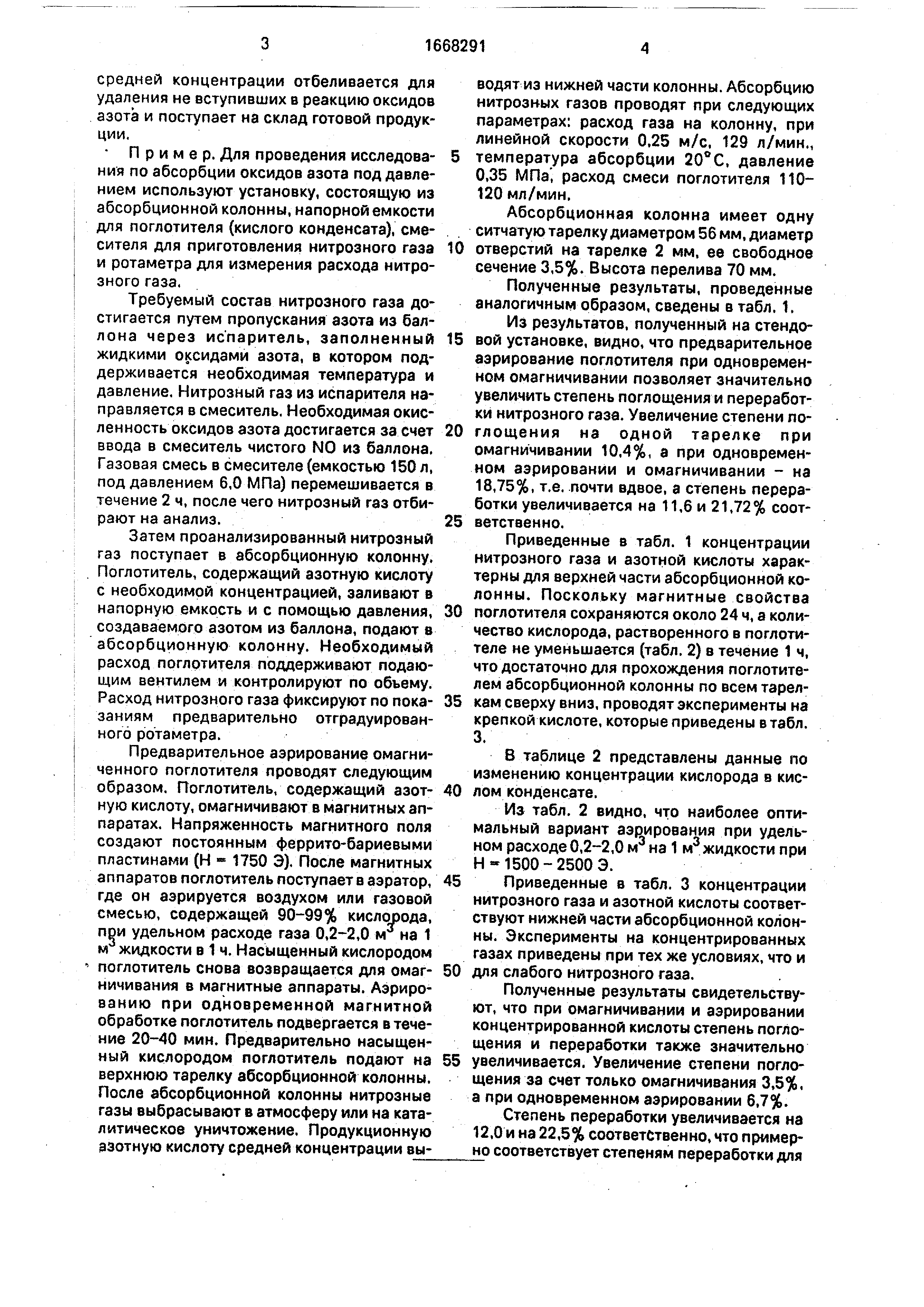 воздуха или газовой смеси 0,2 - 2,0 м3на 1 м3поглотителя в час. Способ позволяет повысить степень переработки оксидов азота в азотную кислоту. 3 табл.