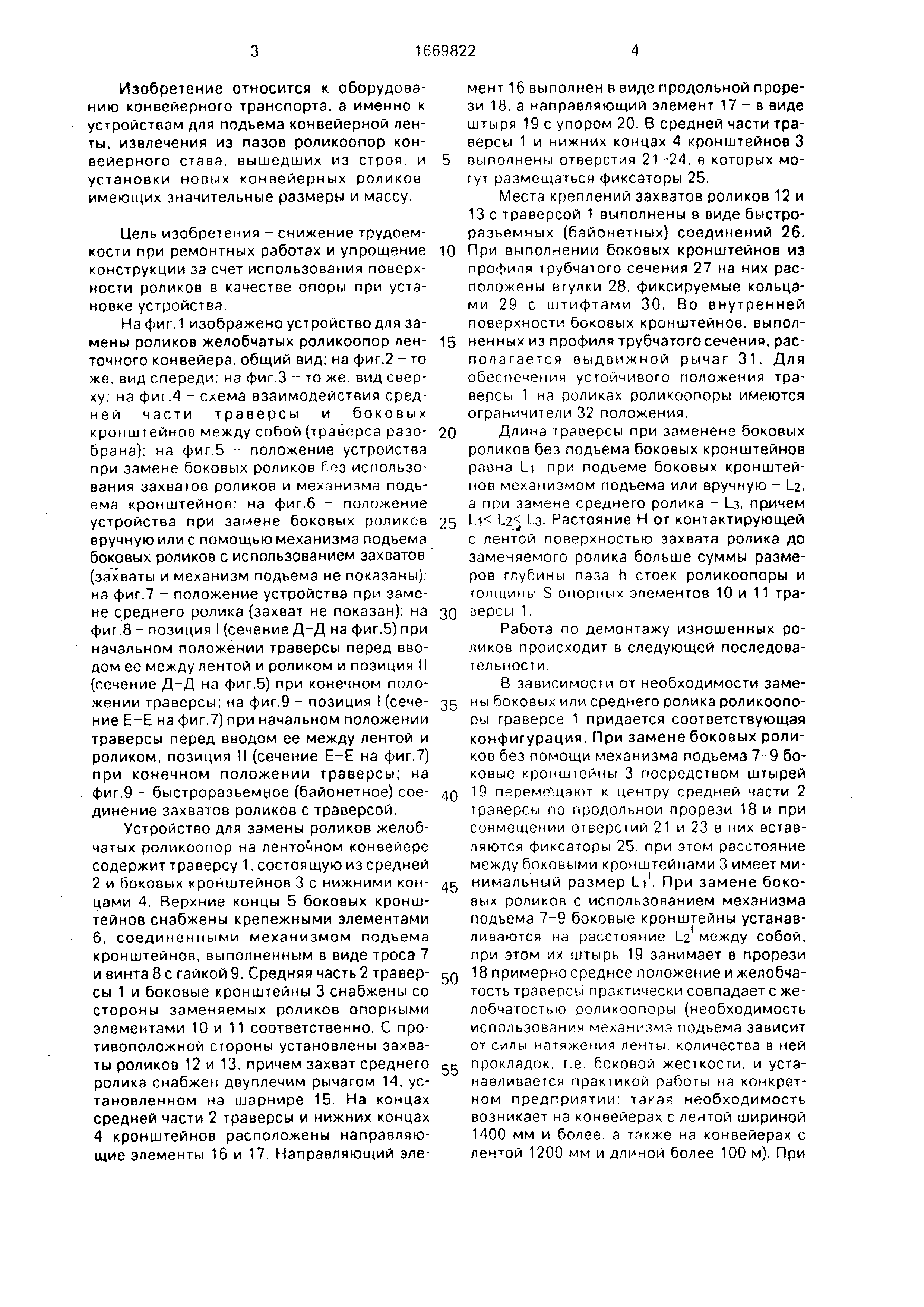 среднего Р желобчатой роликоопоры. Нижние концы К 3 выполнены изогнутыми под углом, равным углу установки боковых Р. При замене Р траверса заводится под ленту конвейера в непосредственной близости к роликоопоре с заменяемыми Р и в слегко наклоненном