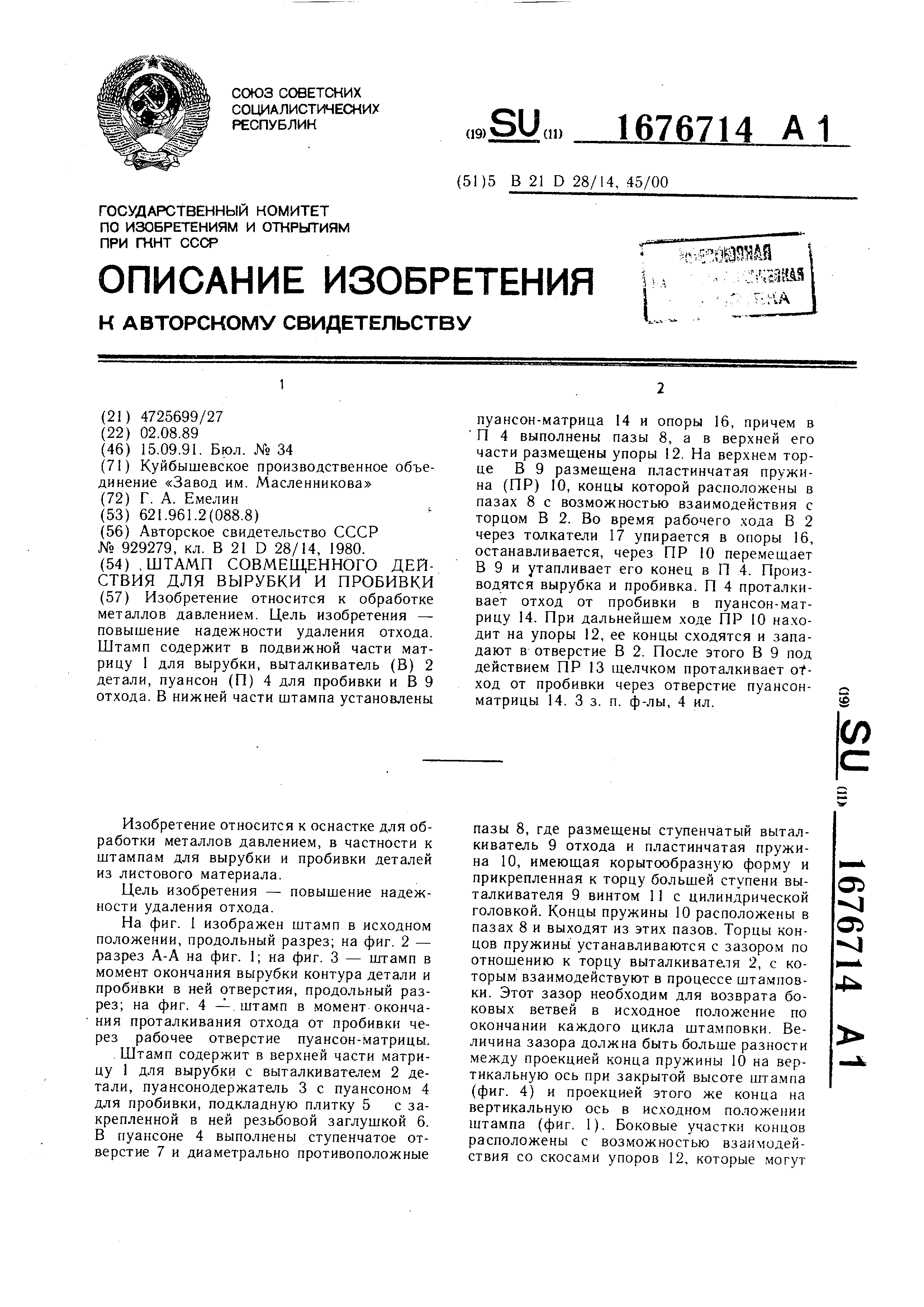 1 для вырубки, выталкиватель (В) 2 детали, пуансон (П) 4 для пробивки и В 9 отхода. В нижней части штампа установлены пуансон-матрица 14 и опоры 16, причем в П 4 выполнены пазы 8, а в верхней его