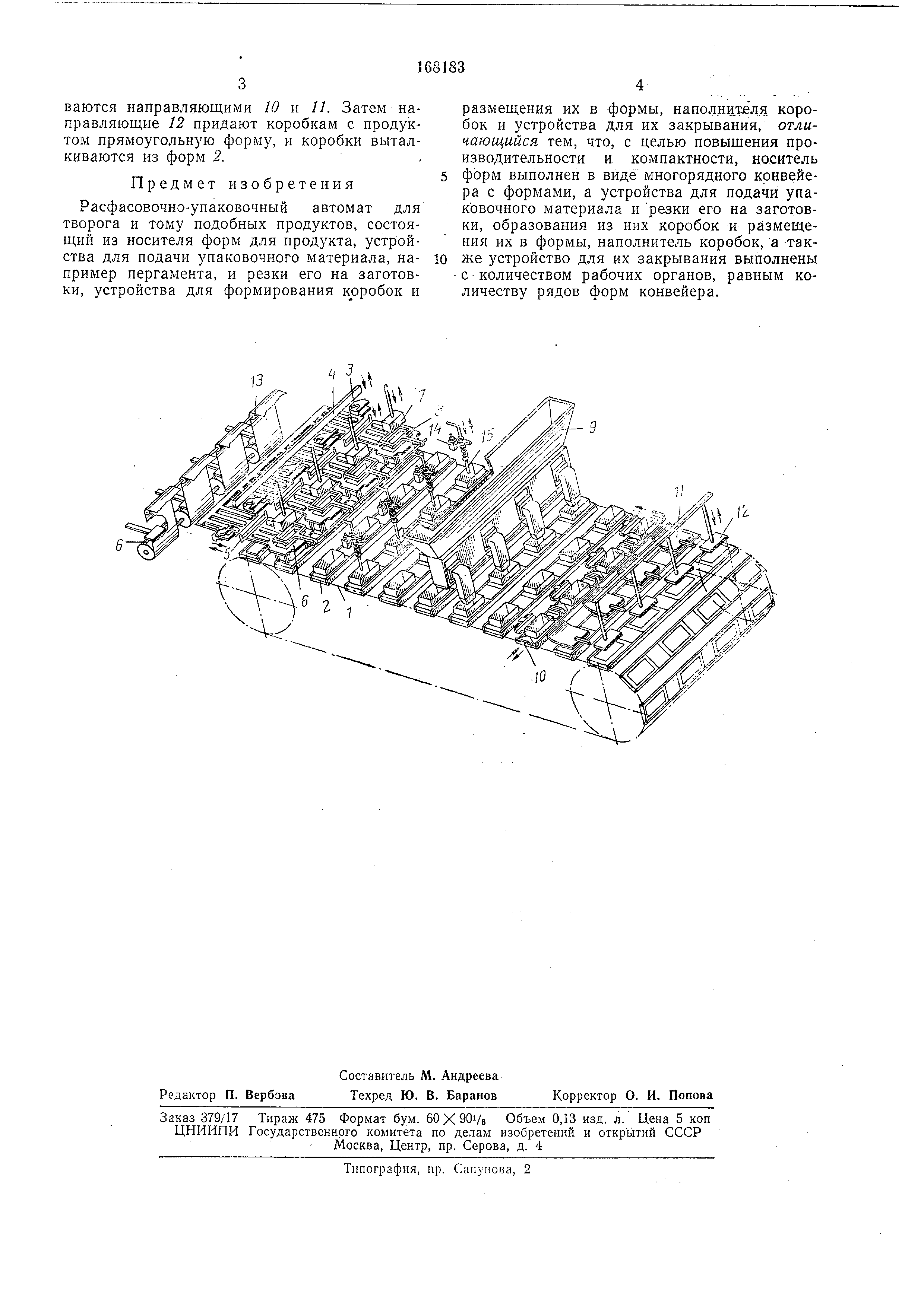 прямоугольную форму, и коробки выталкиваются из форм 2. Предмет изобретения Расфасовочно-упаковочный автомат для творога и тому подобных продуктов, состоящий