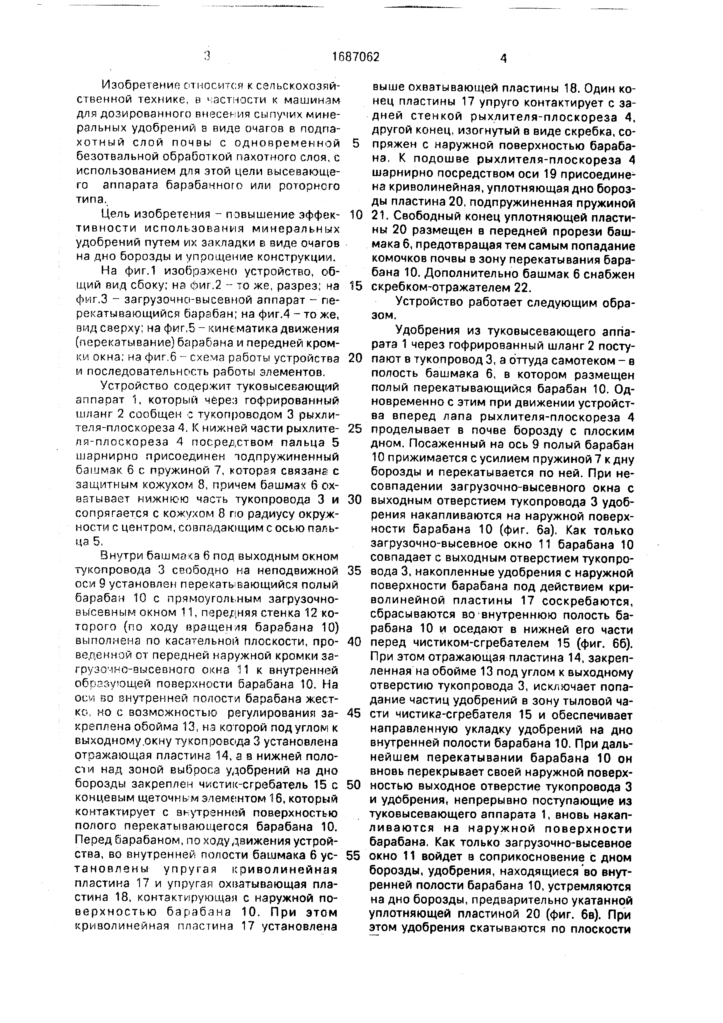 удобрений на дно борозды и необходимую порциональную точность в очагах. При дальнейшем перекатывании полого барабана, вызванного поступательным движением