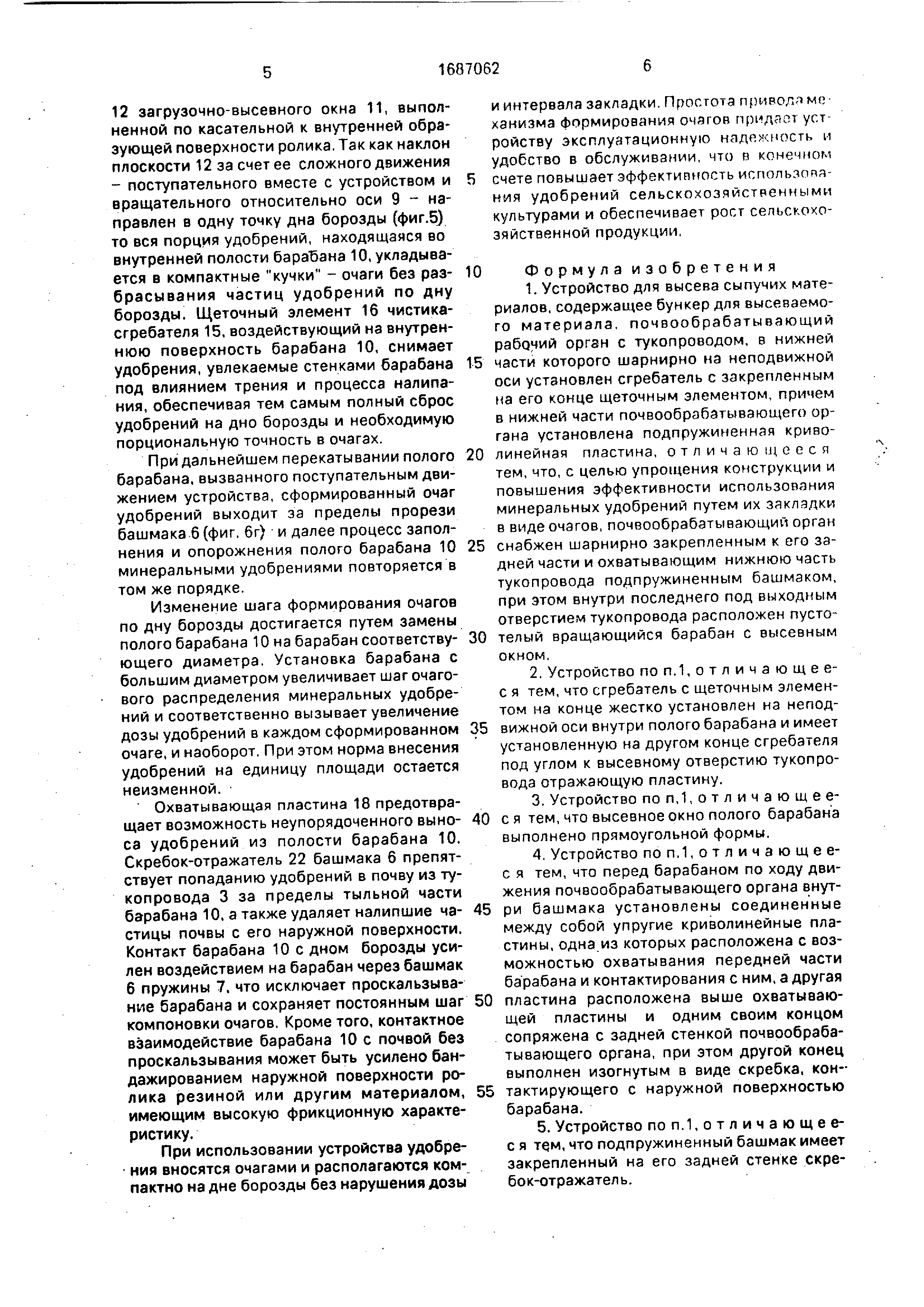 комочков почвы в зону перекатывания барабана 10. Дополнительно башмак 6 снабжен 5 скребком-отражателем 22. Устройство работает следующим образом . Удобрения из туковысевающего аппарата 1 через гофрированный шланг 2 посту0