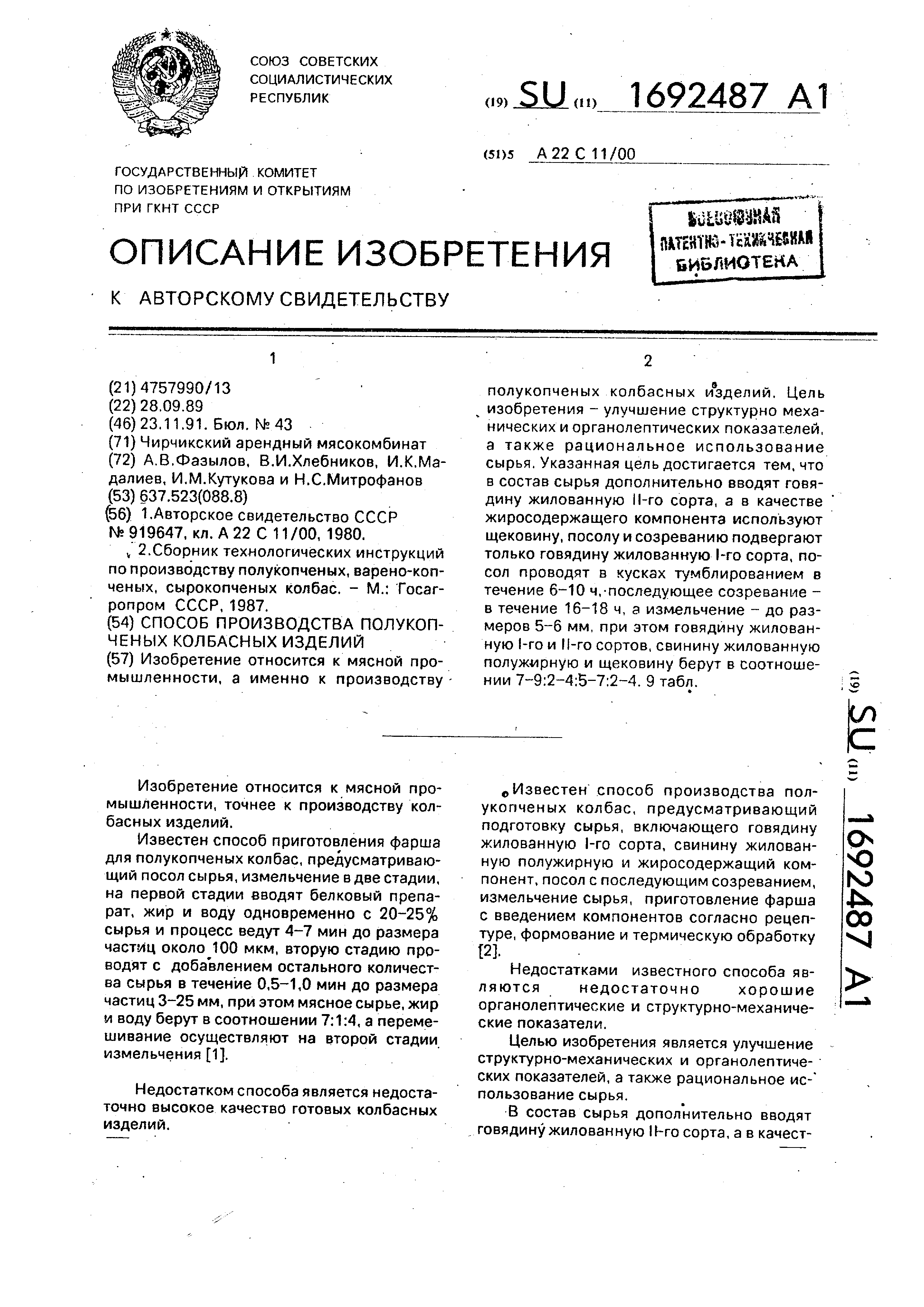 и воду берут в соотношении 7:1:4, а перемешивание осуществляют на второй стадии измельчения 1. Недостатком способа является недостаточно высокое качество готовых колбасных изделий. „Известен способ производства полукопченых колбас, предусматривающий
