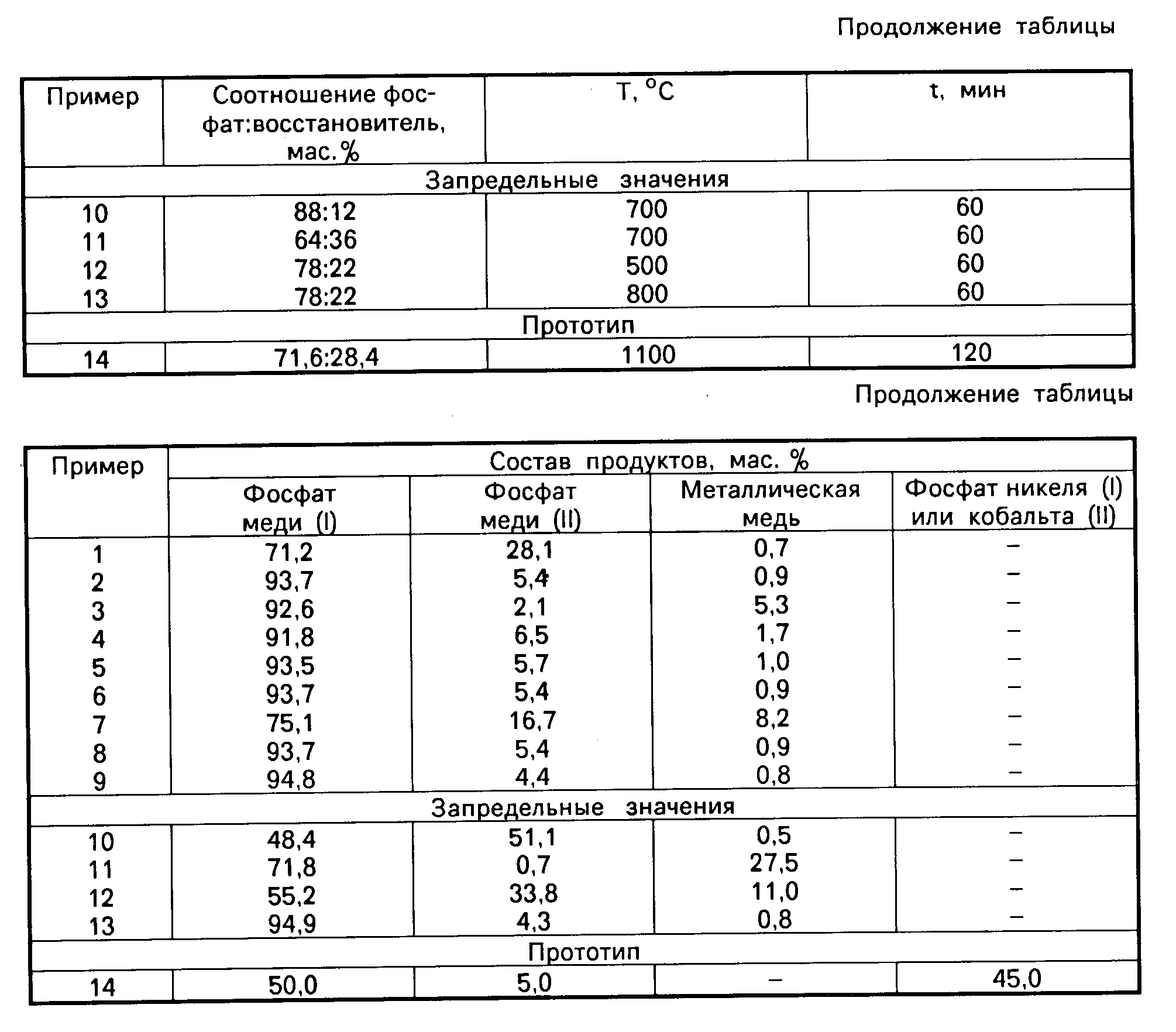 ч без доступа воздуха (в токе инертного газа либо в вакууме). Выход фосфата меди (I) составляет 93,7 мас. Другие примеры осуществления предлагаемого способа приведены в таблице. Как видно из таблицы, оптимальными условиями проведения процесса являются: температура 600-700оС, соотношение реагентов 70-85:15-30 мас. (примеры 1-3). Выход конечного продукта