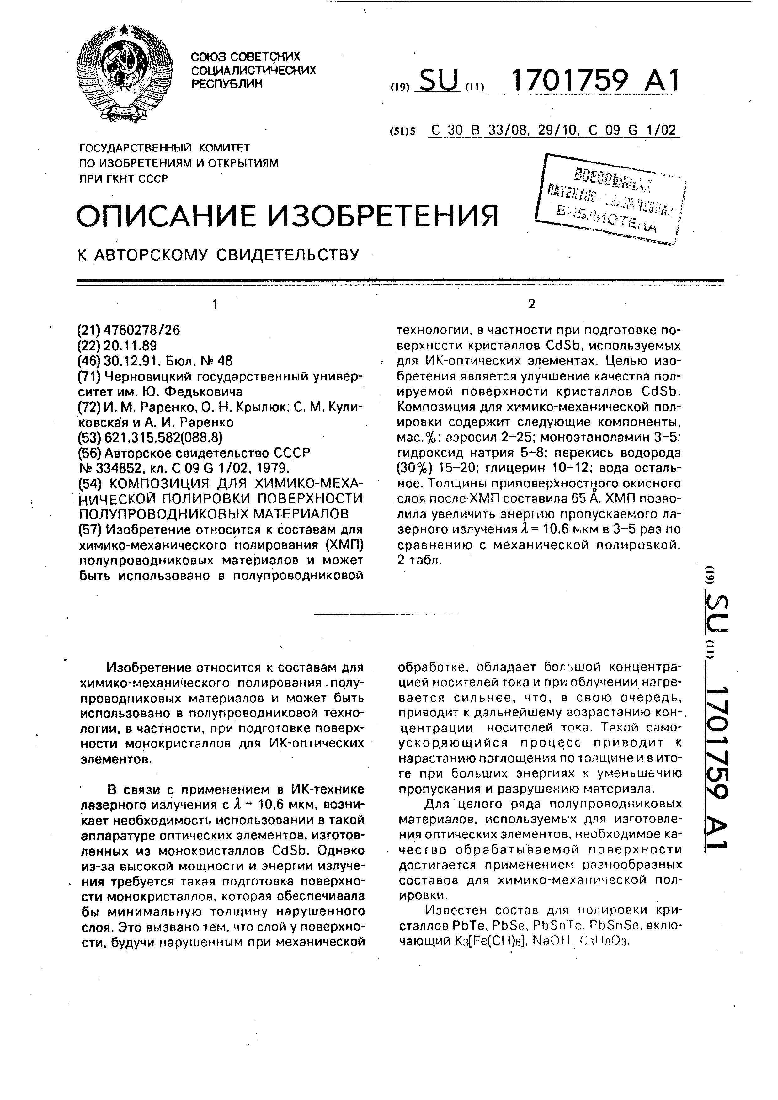 достигается применением разнообразных составов для химико-механической полировки Известен состав для полировки кристаллов PbTe, PbSe, PbSn Ге PbSnSe, включающий (СН)б, NaOH (