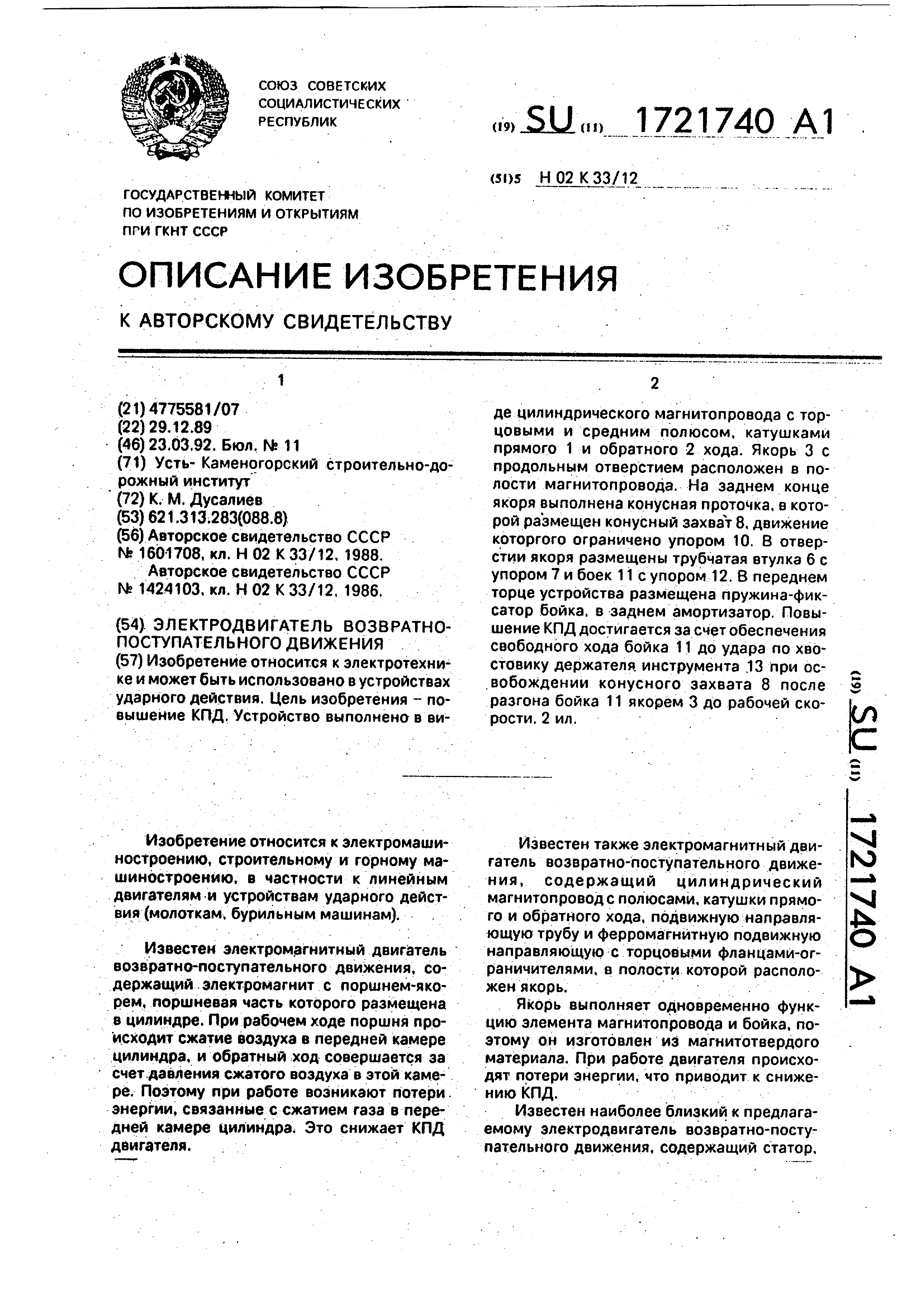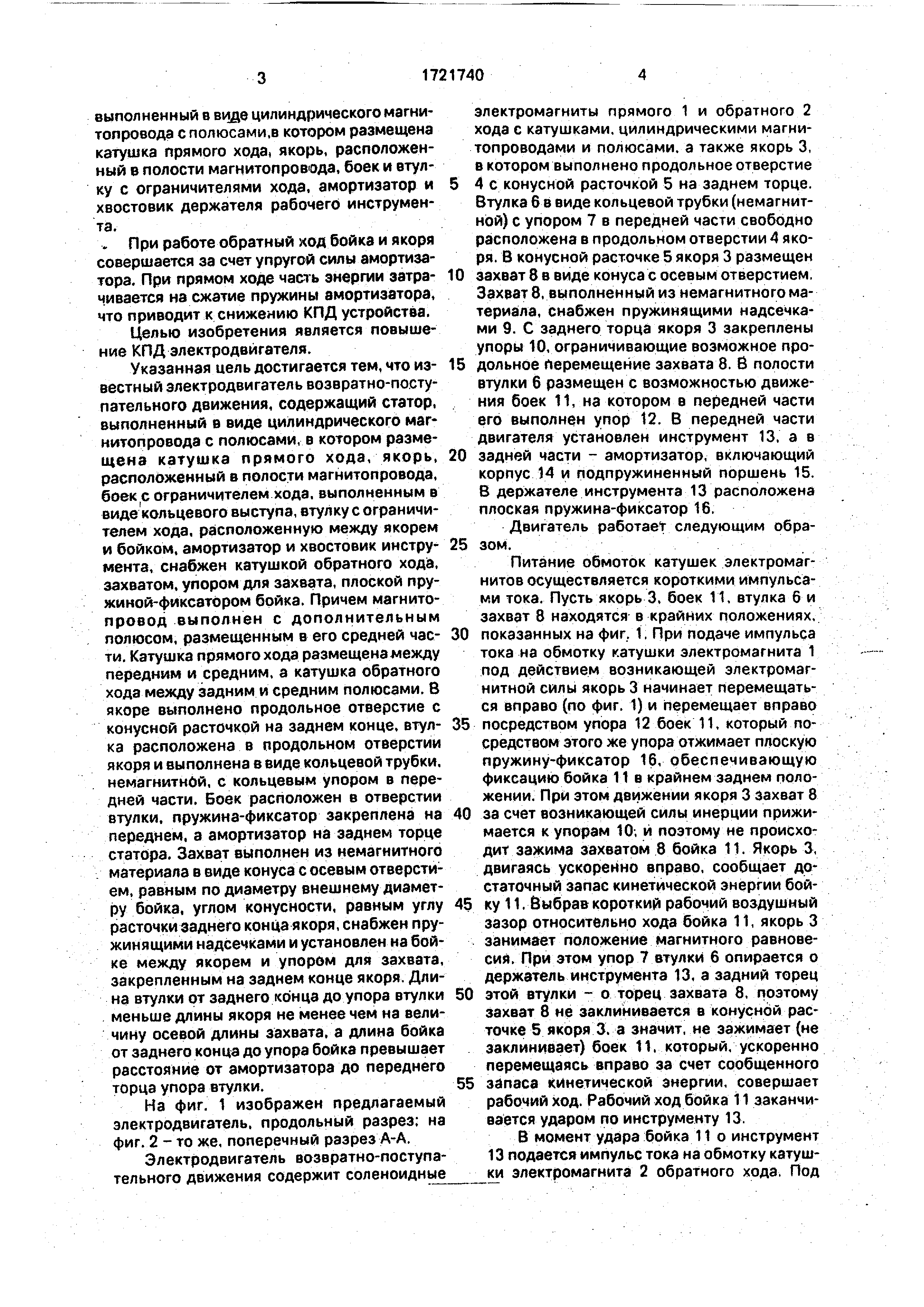 то приводит к снижению КПД устройства. Целью изобретения является повышение КПД электродвигателя. Указанная цель достигается тем, что известный электродвигатель возвратно-поступательного
