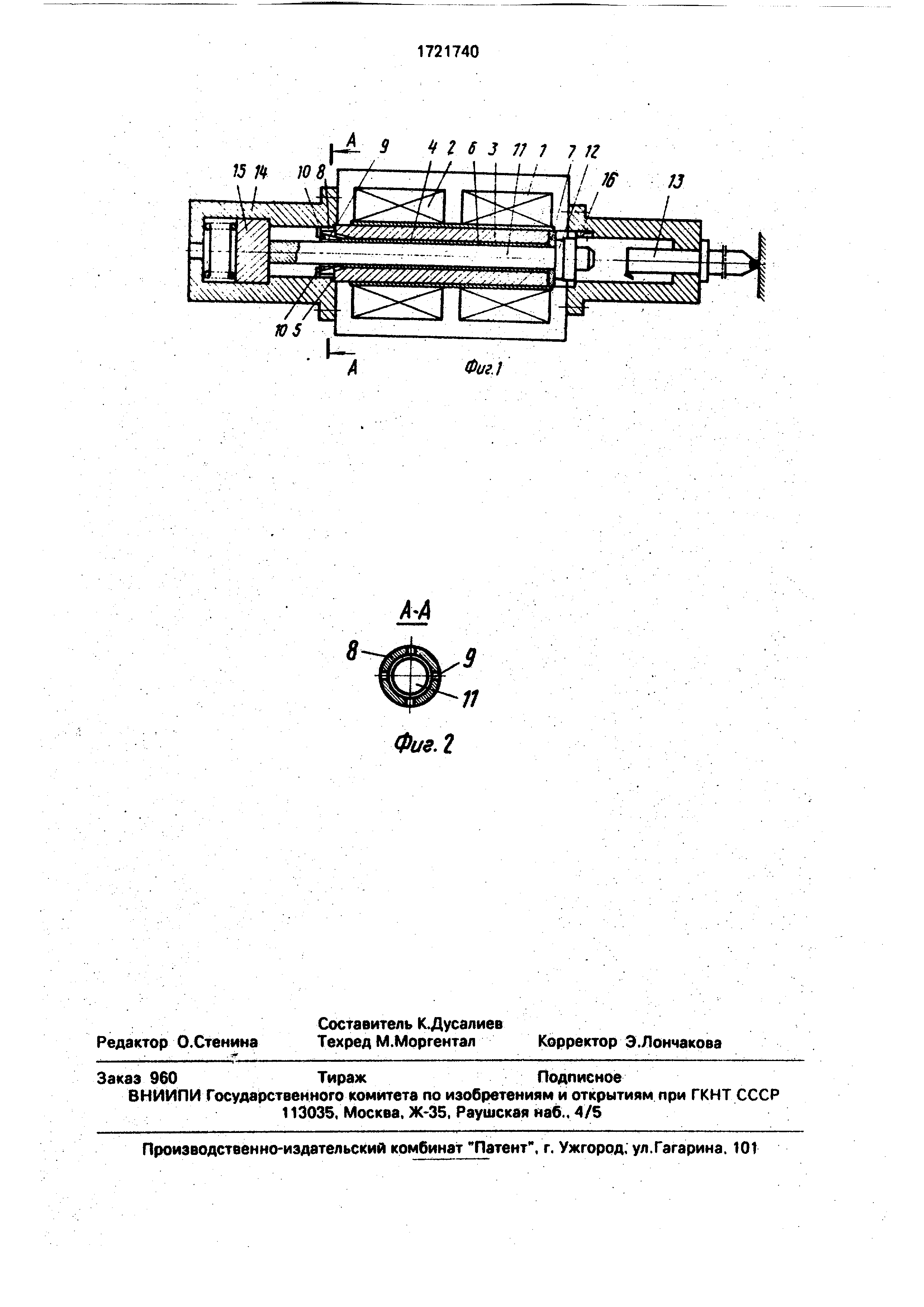 Втулка 6 в виде кольцевой трубки (немагнитной ) с упором 7 в передней части свободно