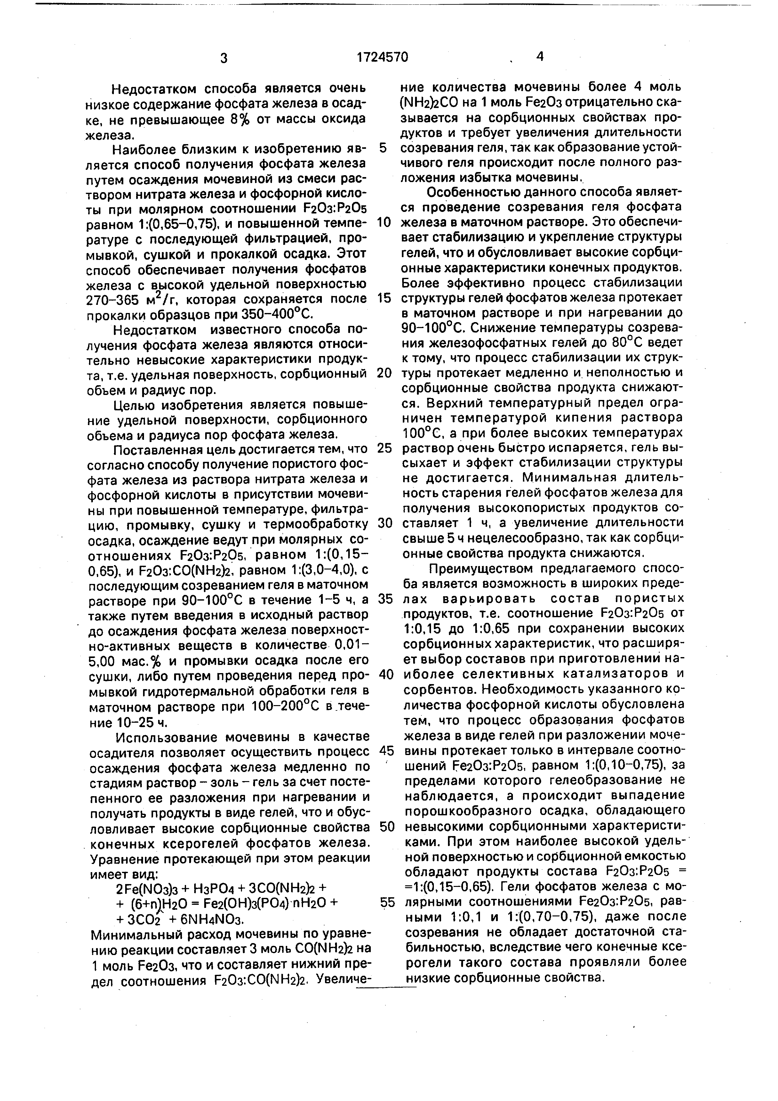 водой от NOs, сушат и прокаливают при 350°С. Полученный фосфат железа имеет