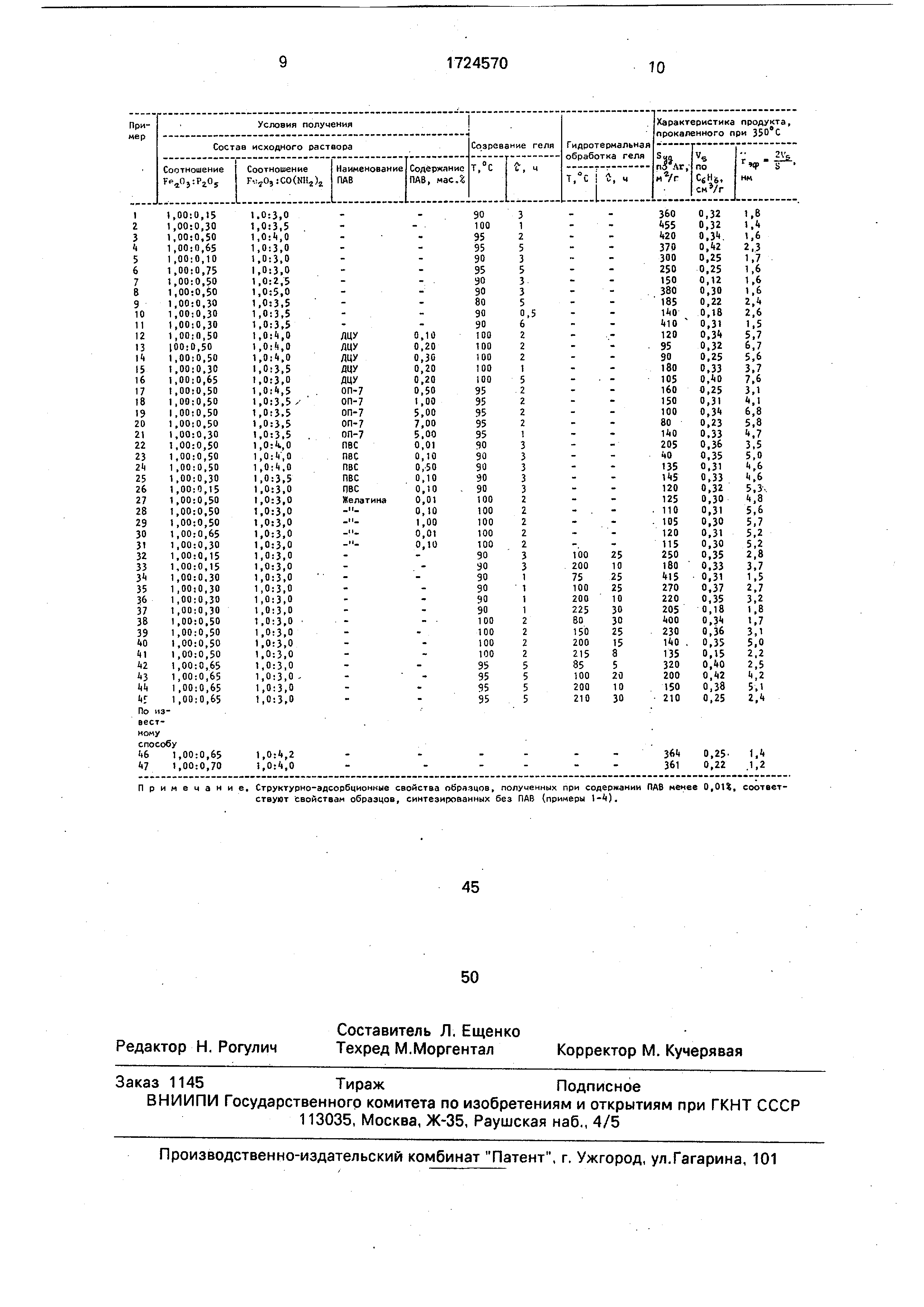 0,34 см3/г и средний радиус пор 1,6 нм. 5Остальные примеры 3-11 выполнены аналогично, но отличаются соотношениями Ре20з:Р20б и Рв20з:СО(МН2)2 и условиями