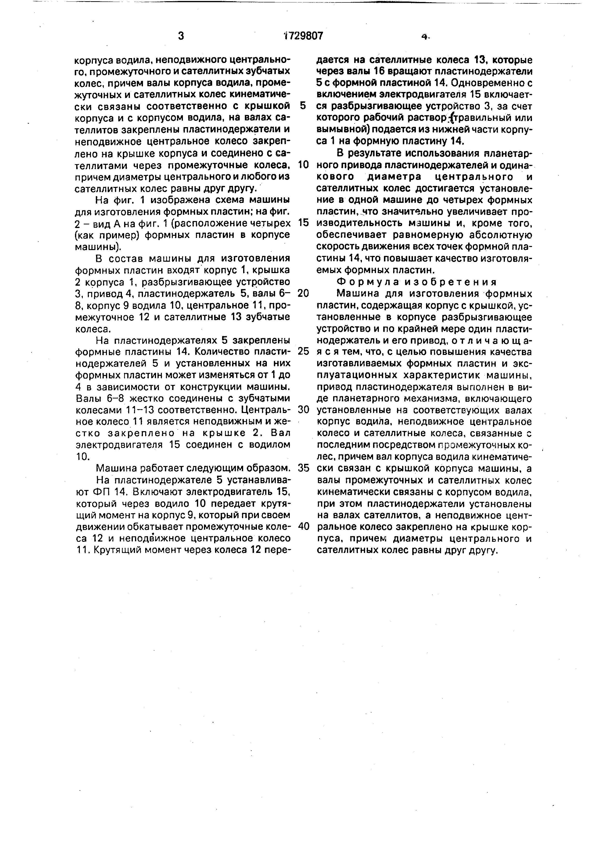 8, корпус 9 водила 10, центральное 11, промежуточное 12 и сателлитные 13 зубчатые колеса. На пластинодержателях 5 закреплены формные пластины 14. Количество пласти-