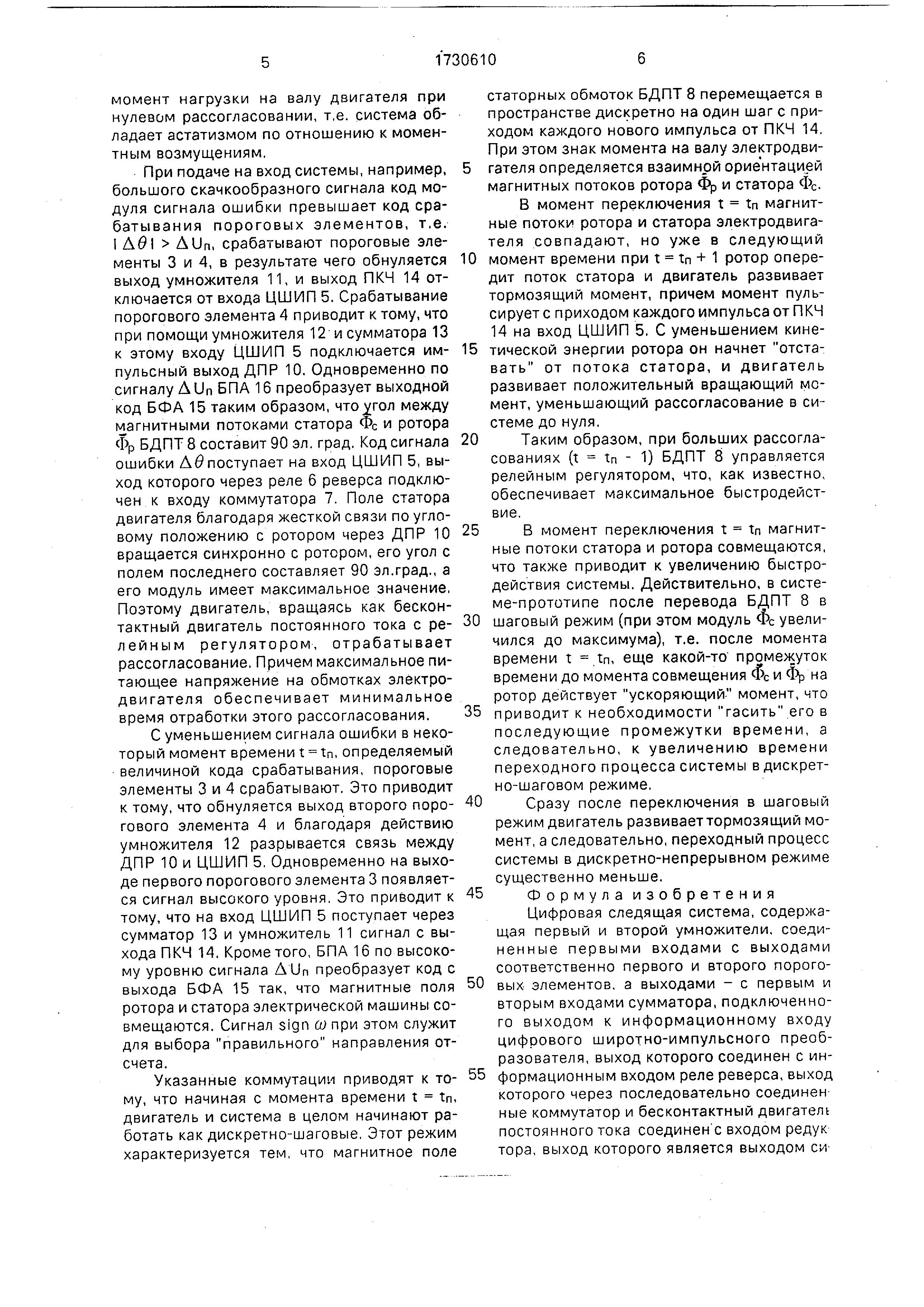 момент времени при t tn + 1 ротор опередит поток статора и двигатель развивает тормозящий момент, причем момент пульсируете приходом каждого импульса от ПКЧ 14 на вход ЦШИП 5. С уменьшением кинетической энергии ротора он начнет отставать от потока статора, и двигатель развивает положительный вращающий момент , уменьшающий рассогласование в системе до нуля.