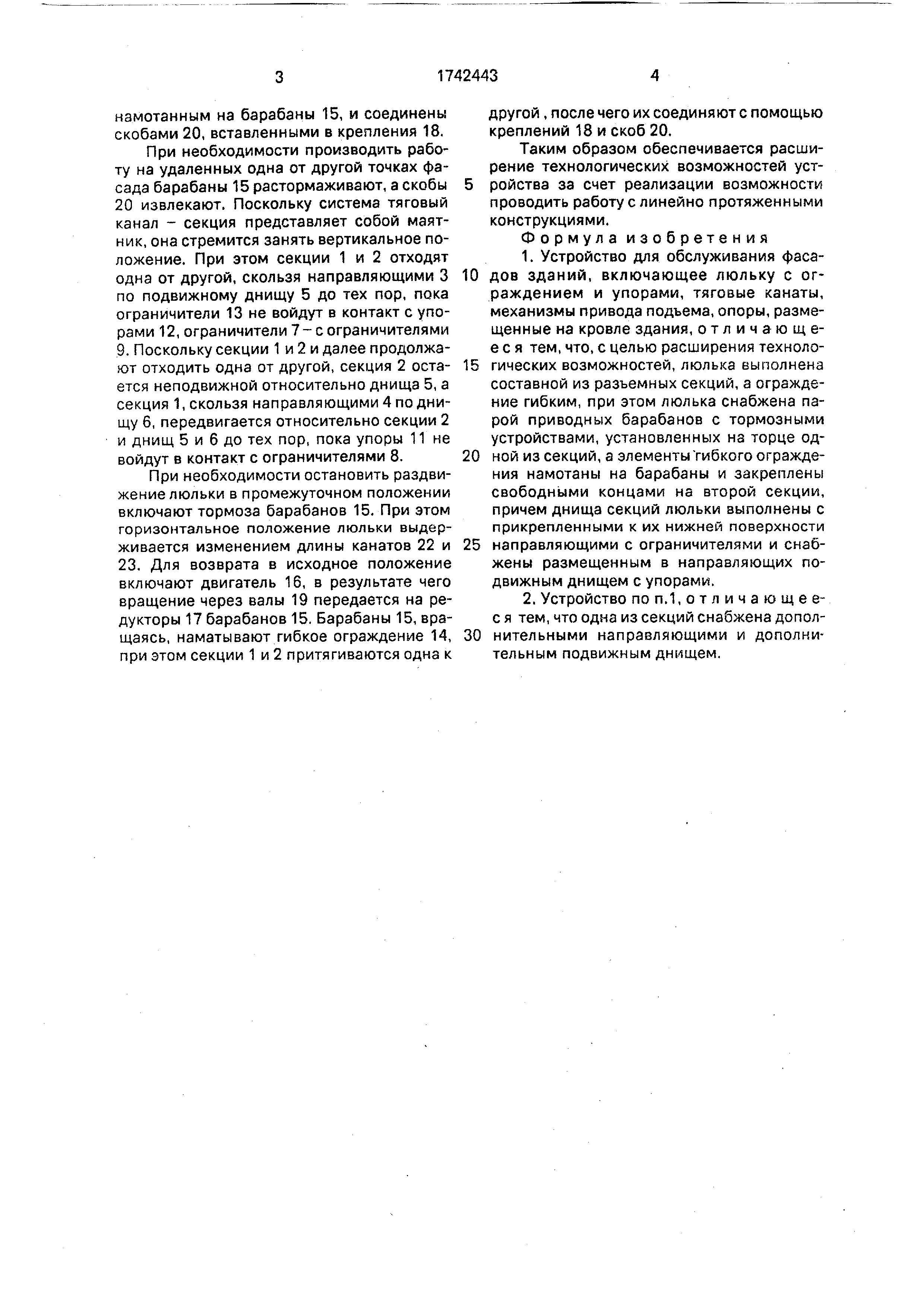 к секциям 1 и 2 люльки. Устройство работает следующим образом . Секции 1 и 2 доставляют в нужную точку фасада посредством изменения длины канатов