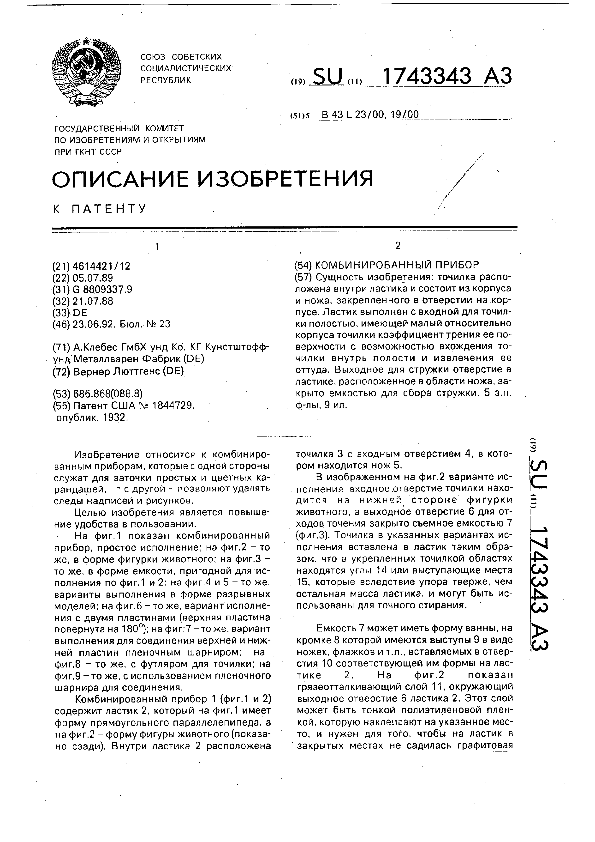 1.Комбинированный прибор, содержащий ластик и точилку, расположенную внутри ластика и состоящую из корпуса и ножа, закрепленного в отверстии на корпусе, о т- личающийся тем. что, с целью повышения удобства в пользовании, ластик выполнен с входной для точилки полостью, имеющей малый относительно корпуса точилки коэффициент трения ее поверхности, с возможностью вхождения точилки в полость и извлечения ее. а выходное для стружки отверстие в ластике, расположенное в области ножа, закрыто съемной емкостью для сбора стружки.